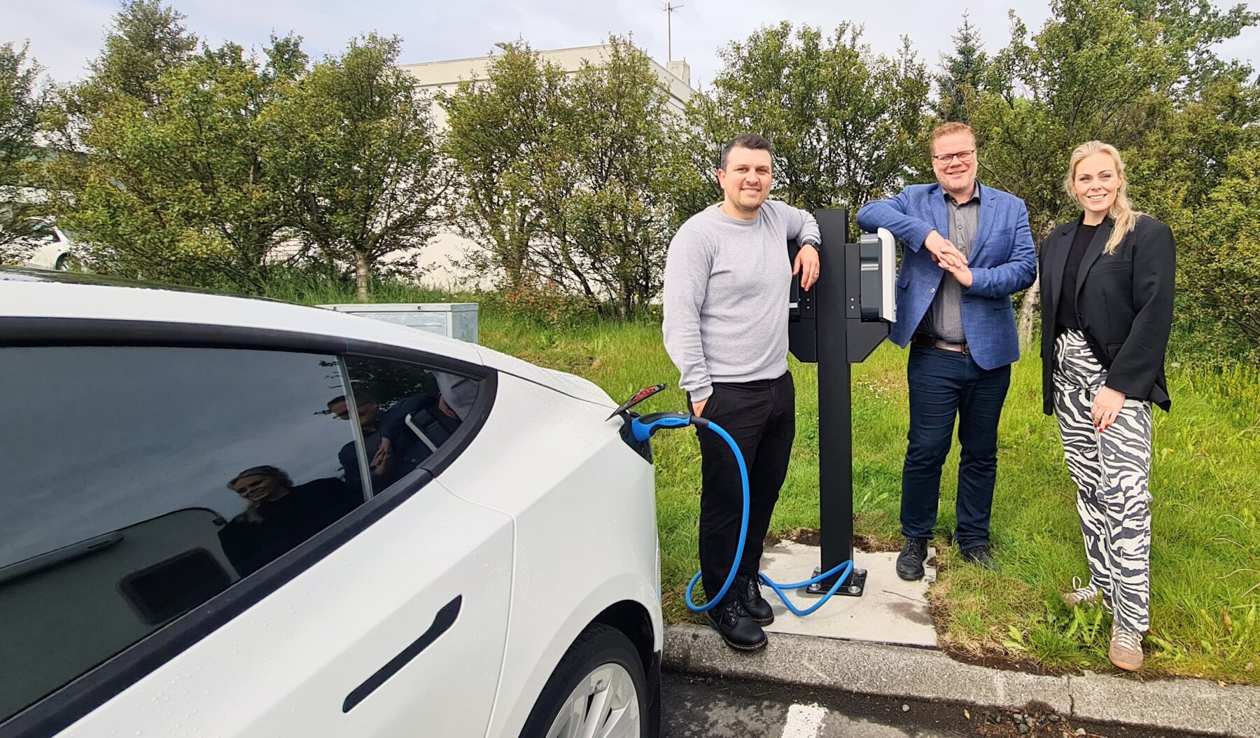 Á mynd: Tómas Karl Guðsteinsson, sölu og þjónustustjóri, Valdimar Víðisson bæjarstjóri og Salóme Guðmundsdóttir, framkvæmdastjóri Ísorku.