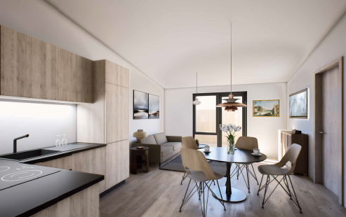 Aðalinngangur hússins er sunnan megin og býður upp á gott aðgengi bæði fyrir gangandi og akandi. Við innganginn er skjólgott útisvæði með setrýmum og gróðri sem skapar hlýlegt umhverfi. Innan við innganginn tekur við rúmgott anddyri sem leiðir beint inn í miðlægan tengigang, hjarta hússins, sem tengir saman íbúðir, starfsmanna- og stoðrými.
