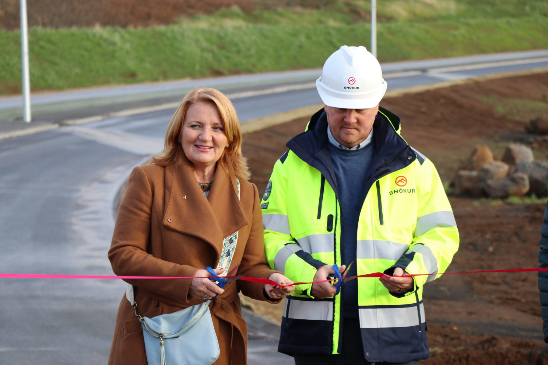 Rósa Guðbjartsdóttir bæjarstjóri Hafnarfjarðar og Kristmundur Einarsson framkvæmdastjóri Snóks hf. klipptu á borða og opnuðu Ásvallabrautina formlega.