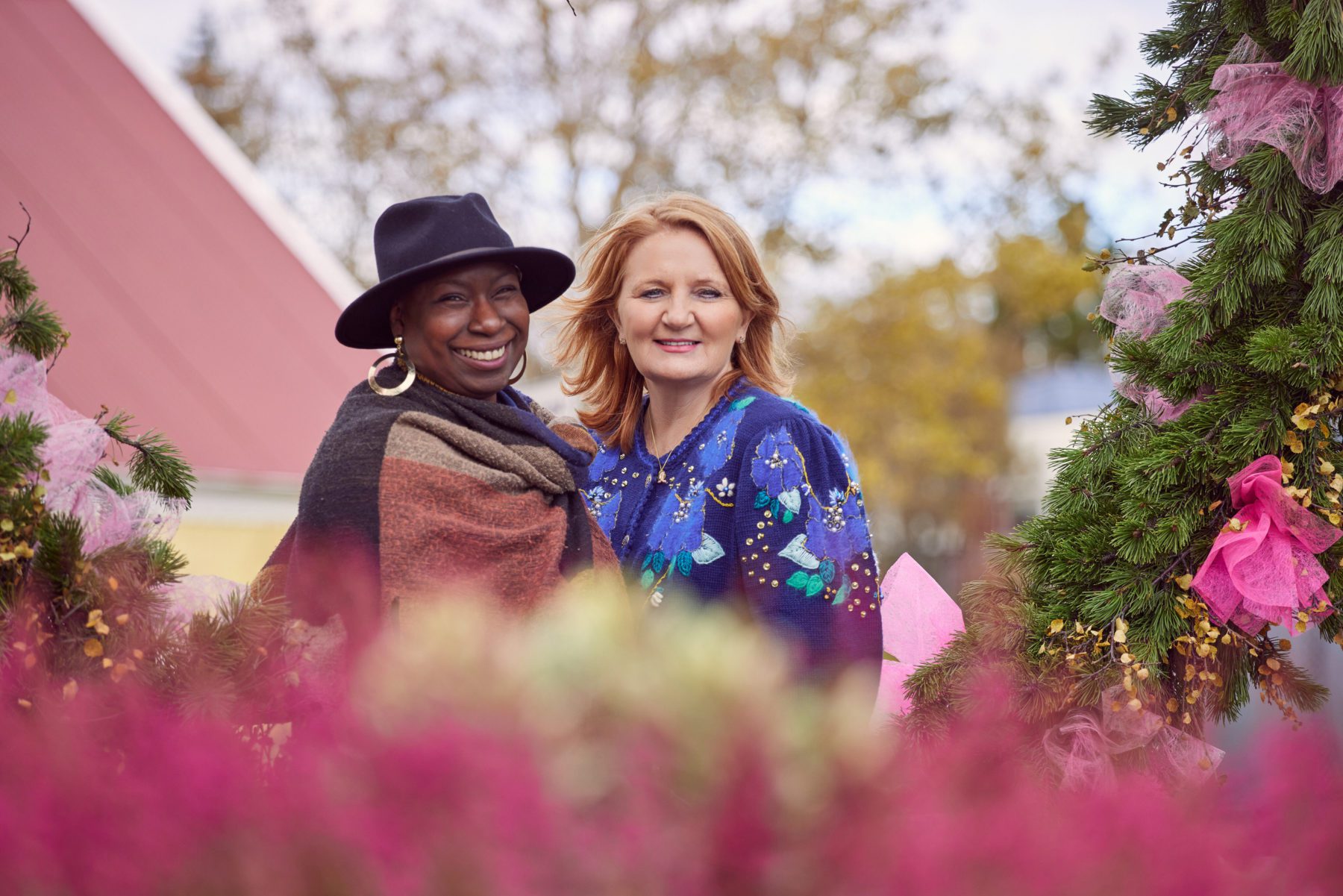Alice Olivia Clarke með Rósu Guðbjartsdóttir bæjarstjóra Hafnarfjarðar í hjarta Hafnarfjarðar sem verður bleiktóna allan október og þannig tileinkað baráttunni gegn krabbameini hjá konum.