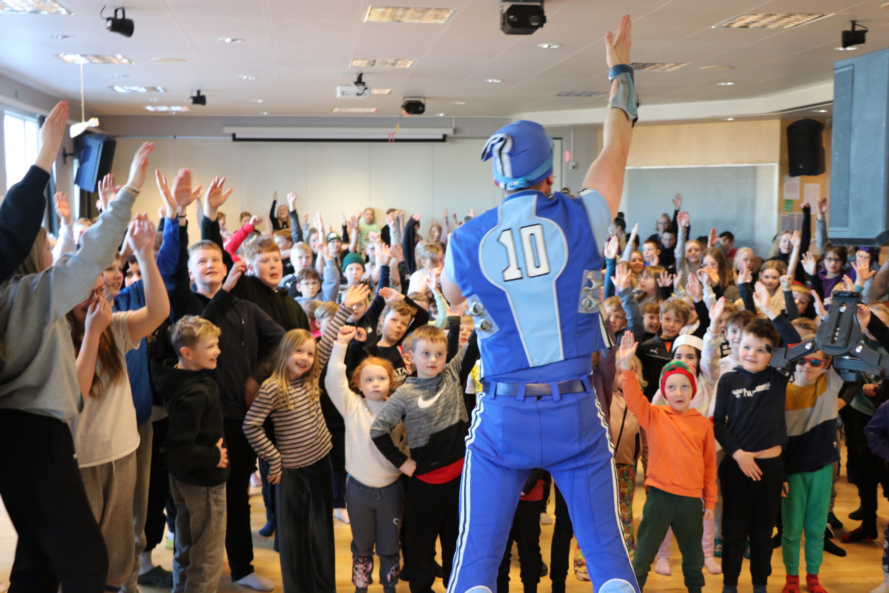 Íþróttaálfurinn kíkti í heimsókn og hvatti nemendur áfram. Þeir hoppuðu með honum á sal í tilefni árangursins sem er eftirtektarverður því þetta er í fyrsta sinn sem skólinn tekur þátt.