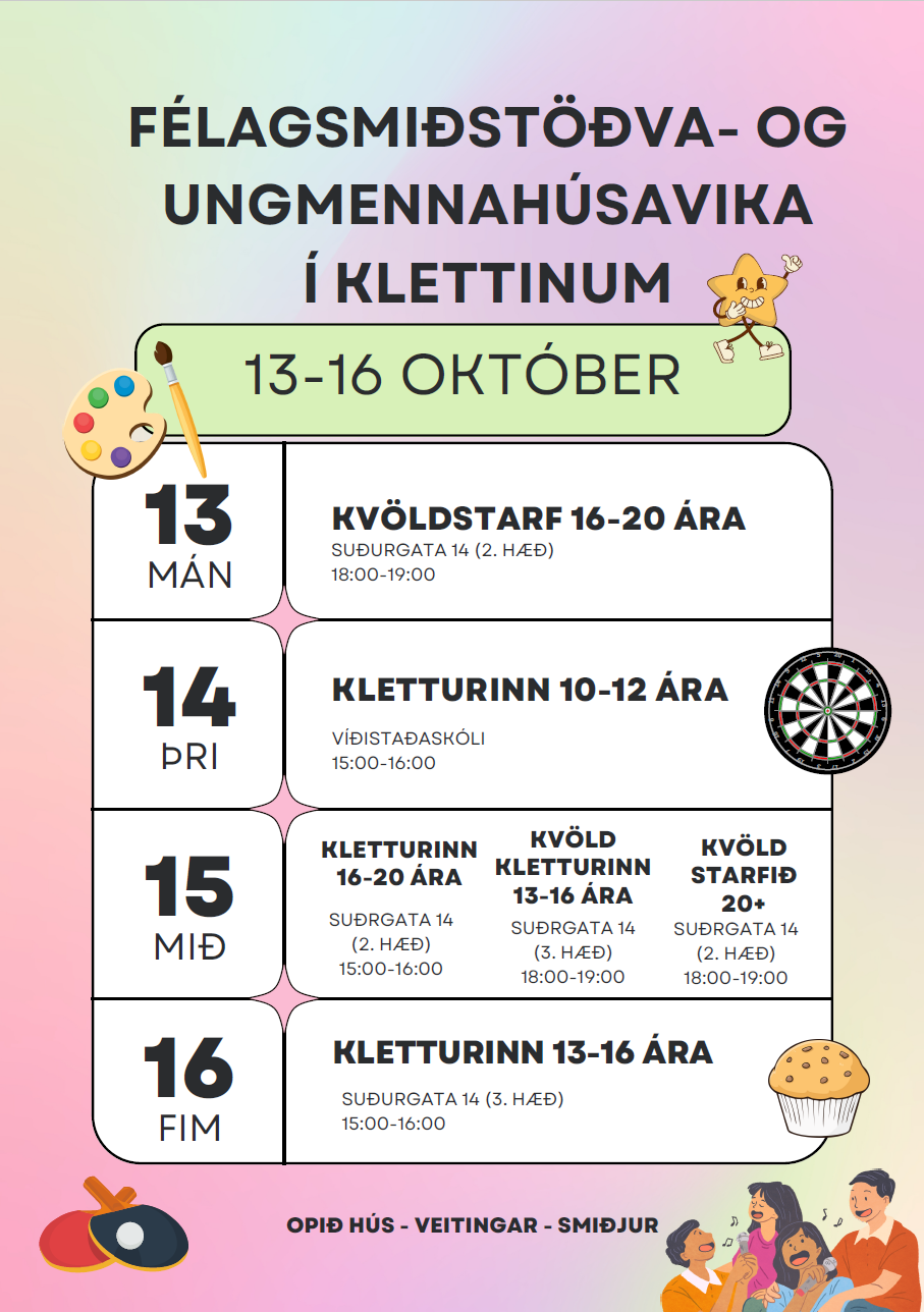 Félagsmiðstöðva- og ungmennahúsavinna verður í Hafnarfirði í næstu viku. Vikan hefur það að markmiði að varpa ljósi á mikilvægi og virði þessa vettvangs fyrir börn og ungmenni. Foreldrar, forráðamenn, systkini, vinir og aðrir aðstandendur eru hvött til að kynni sér starfsemi stöðvanna í sínu hverfi og fjöldi viðburða í boði.