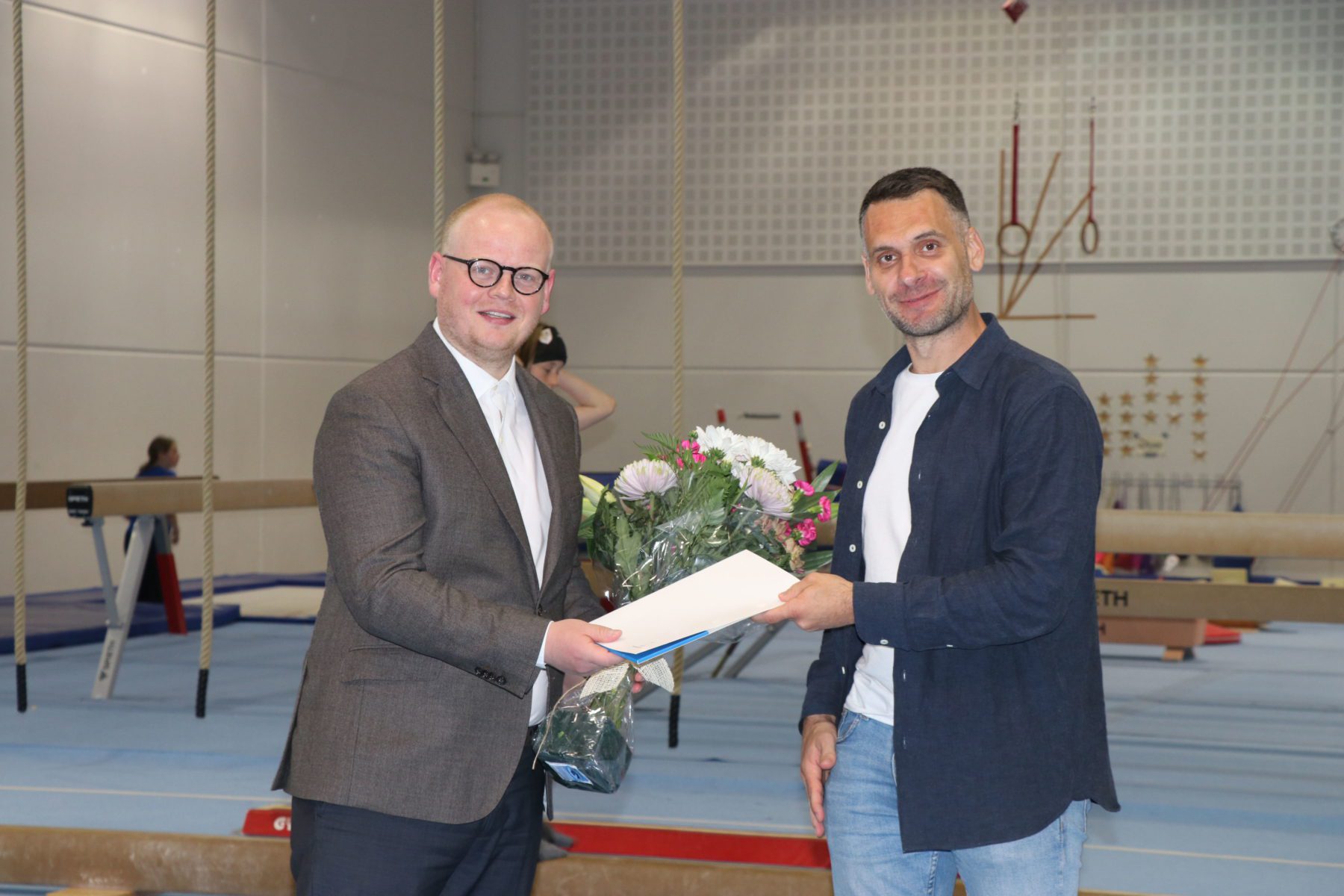 Ágúst Bjarni Garðarsson, formaður bæjarráðs Hafnarfjarðar, mætti til veislu fyrir hönd Hafnarfjarðarbæjar og færði framkvæmdastjóra félagsins, Sigurði Frey Bjarnasyni, fallegan blómvönd og peningagjöf.