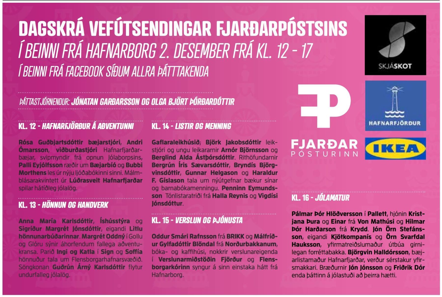 Fjarðarpósturinn mun, í samvinnu við Hafnarfjarðarbæ og Jólaþorpið í Hafnarfirði, standa að beinni vefútsendingu sunnudaginn 2. desember. Útsendingin verður frá gamla apótekinu í Hafnarborg og mun meðal annars þekkt listafólk stíga á stokk, svo sem Bubbi Morthens, Guðrún Árný Karlsdóttir, Jón Jónsson og Friðrik Dór. Um 50 manns munu koma fram í þáttunum og sér IKEA um að mubla upp þrjú glæsileg og jólaleg svið fyrir útsendinguna.