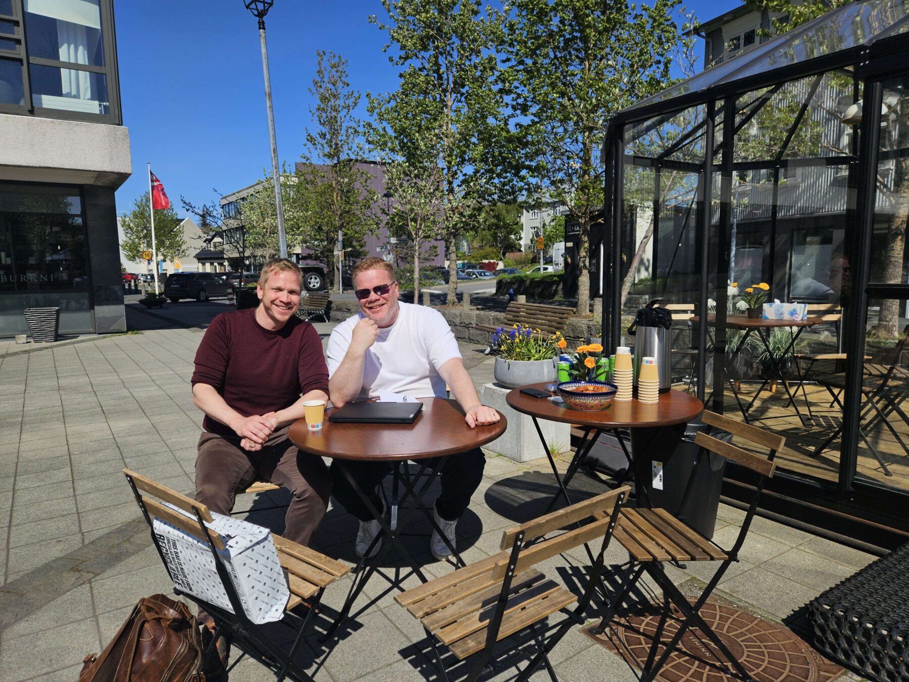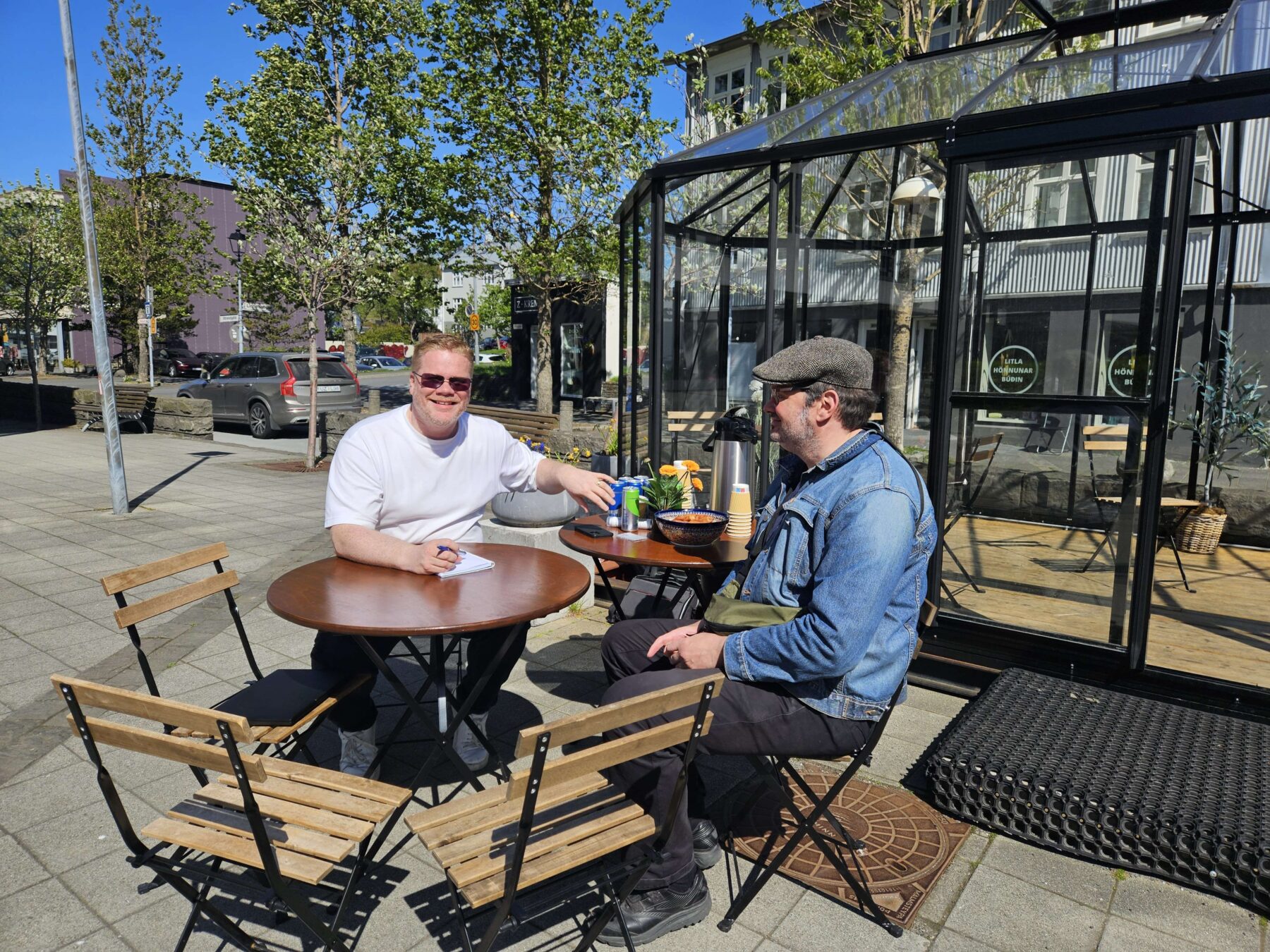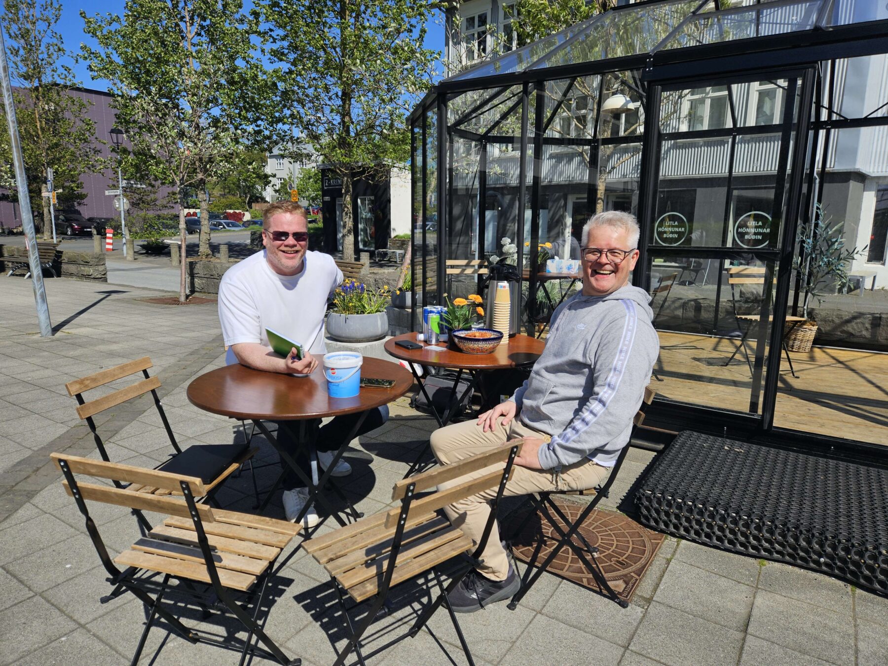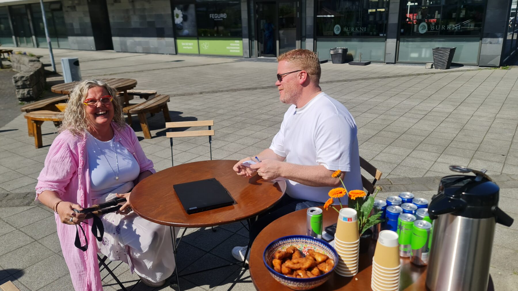 Veðrið var með afbrigðum gott á föstudag. Því varð að færa aðstöðuna úr glæsilegu glerhýsinu á stéttina fyrir utan.