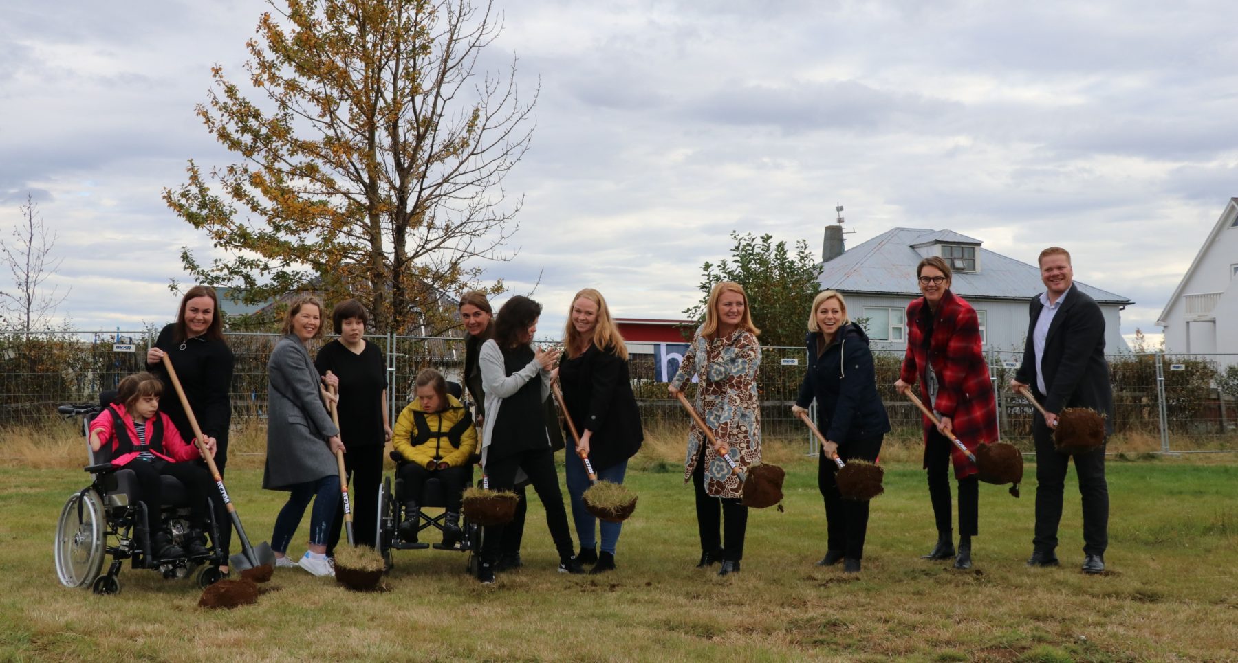 Hér má sjá Rósu Guðbjartsdóttur bæjarstjóra Hafnarfjarðar og Dagmar Þorsteinsdóttur framkvæmdastjóri HBH Byggis ehf. við skóflustunguna ásamt fjórum væntanlegum íbúum. Með á myndinni eru jafnframt sviðsstjóri fjölskyldu- og barnamálasviðs Hafnarfjarðarbæjar, formaður fjölskylduráðs auk fleiri starfsmanna hjá Hafnarfjarðarbæ.