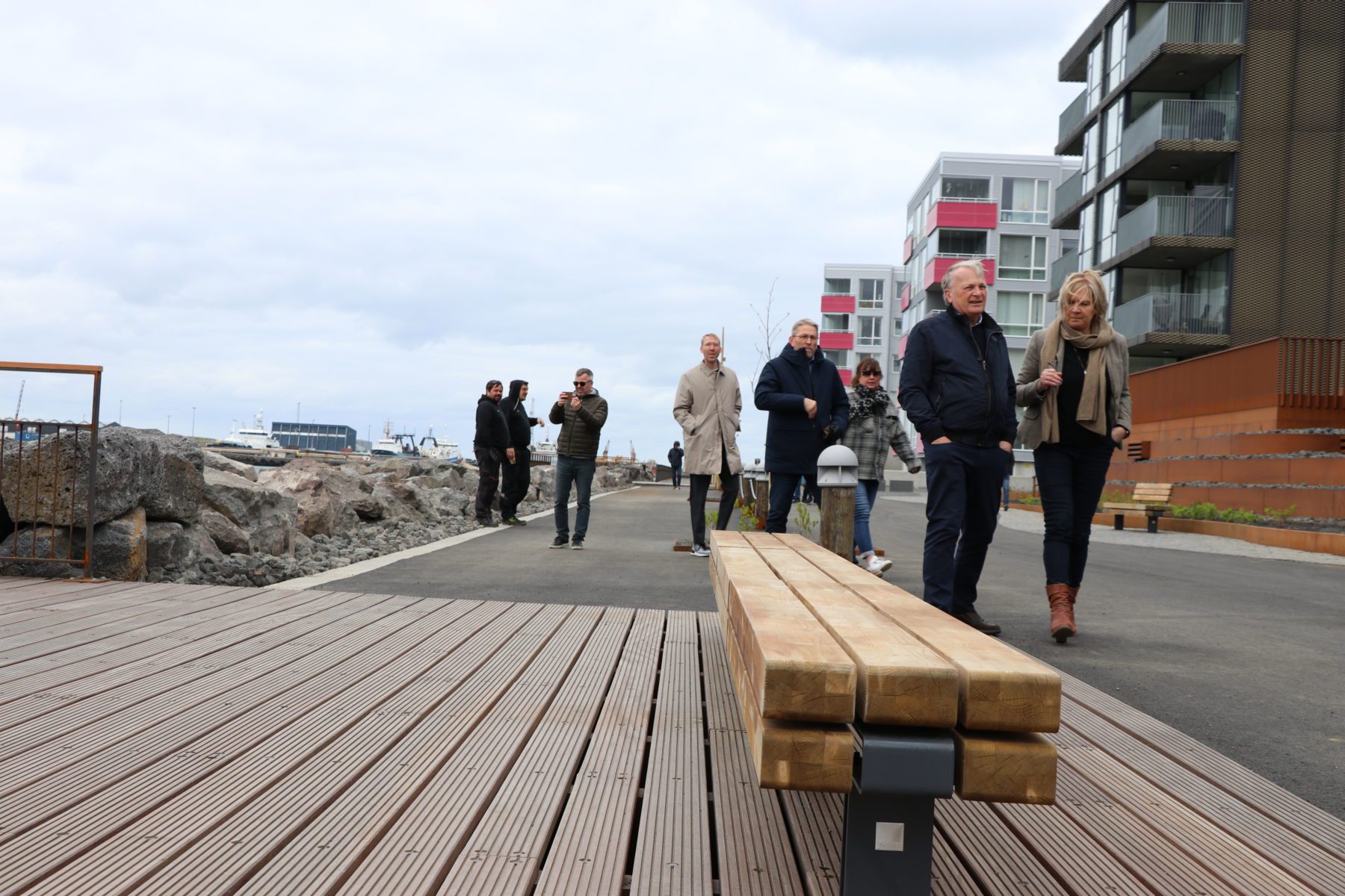 Framkvæmdir við frágang á Norðurbakkasvæðinu hafa staðið yfir í rúmt ár. Framkvæmdir hófust í upphafi árs 2021 með hleðslu grjótvarnar á Norðurbakkann og í framhaldinu var grjótvörn sett á Norðurgarð. Endurbygging Norðurgarðs hófst haustið 2021 og þessa dagana er frágangi á yfirborði Norðurbakka að ljúka. Þessum áfangasigri var fagnað í veðurblíðunni í dag þar sem framkvæmdaraðilar, bæjarfulltrúar, bæjarstjóri og starfsfólk komu saman, gengu um bakkann, skoðuðu afraksturinn og ræddu framtíðina á svæðinu.