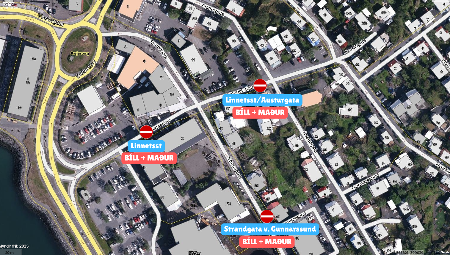 Vegna skrúðgöngu og 17. júní hátíðarhalda verður ýmist tímabundið lokað fyrir umferð bifreiða og/eða umferð handstýrt. Í gildi milli kl.12:00-22:00 þriðjudaginn 17. júní.