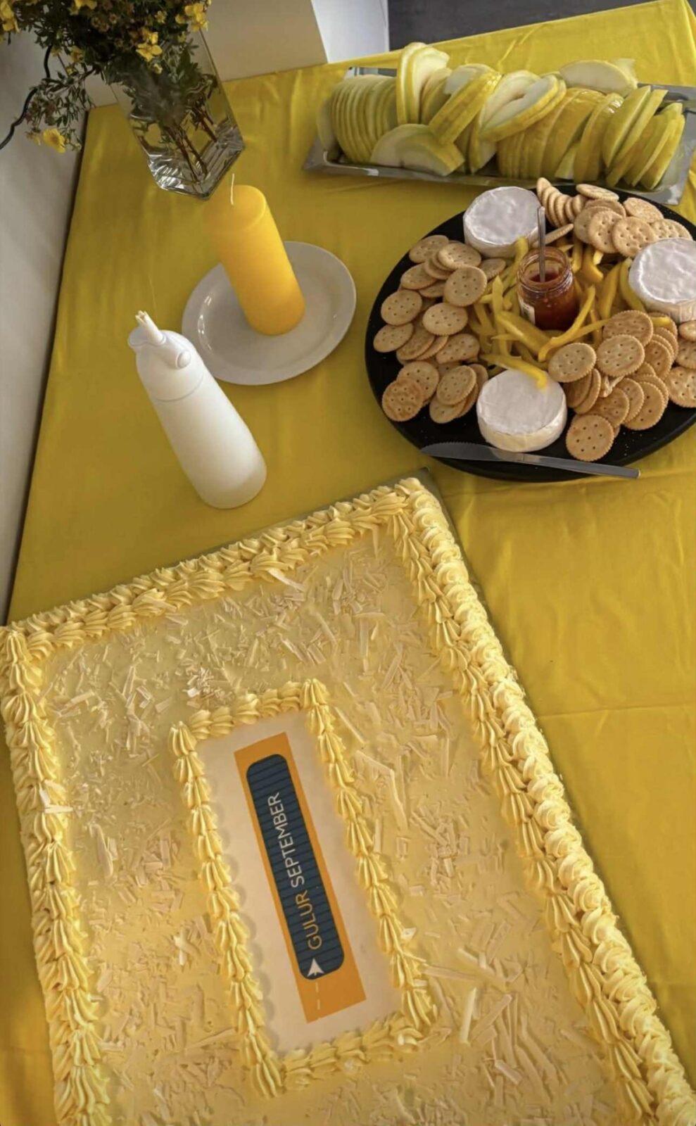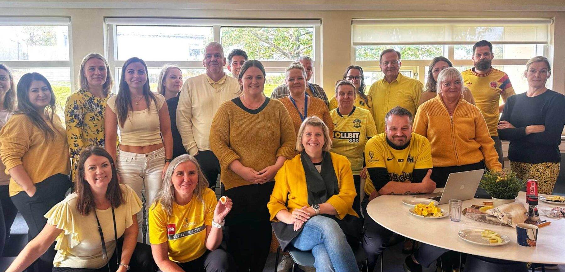 Víða mátti sjá gula litinn á starfsstöðvum Hafnarfjarðarbæjar í dag. „Við tókum þetta alla leið,“ segir Margrét Sverrisdóttir, skólastjóri Öldutúnsskóla, um stemninguna þar. Hún, rétt eins og starfsfólk og fjölmargir nemendur, var í gulum bol í tilefni guls septembermánaðar. Gul kaka, gulir dúkar, gulur drykkur og gulir þristar kættu starfsfólkið.