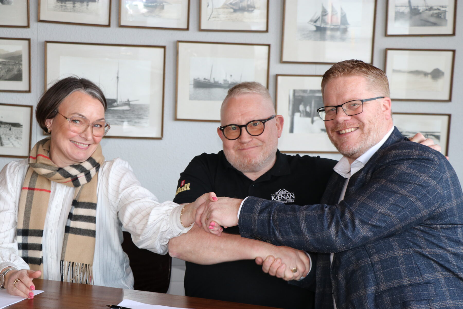 Við afgreiðsluborðið. Valdimar Víðisson bæjarstjóri með þeim Helgu Ösp Jóhannsdóttur og Oddsteini Gíslasyni eigendum Kænunnar.