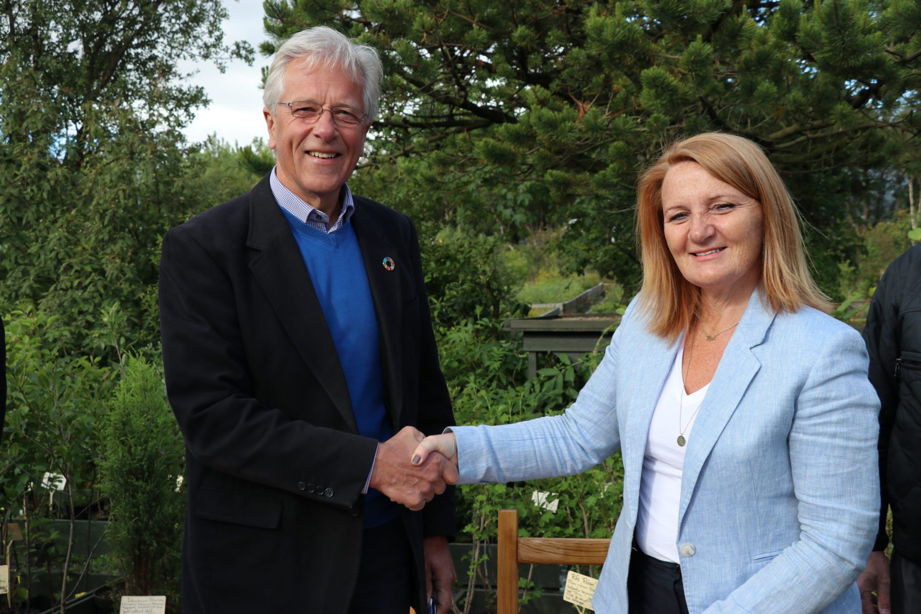 Rósa Guðbjartsdóttir bæjarstjóri og Reynir Kristinsson stjórnarformaður Kolviðs handsala hér samning um kolefnisjöfnun sveitarfélagsins.