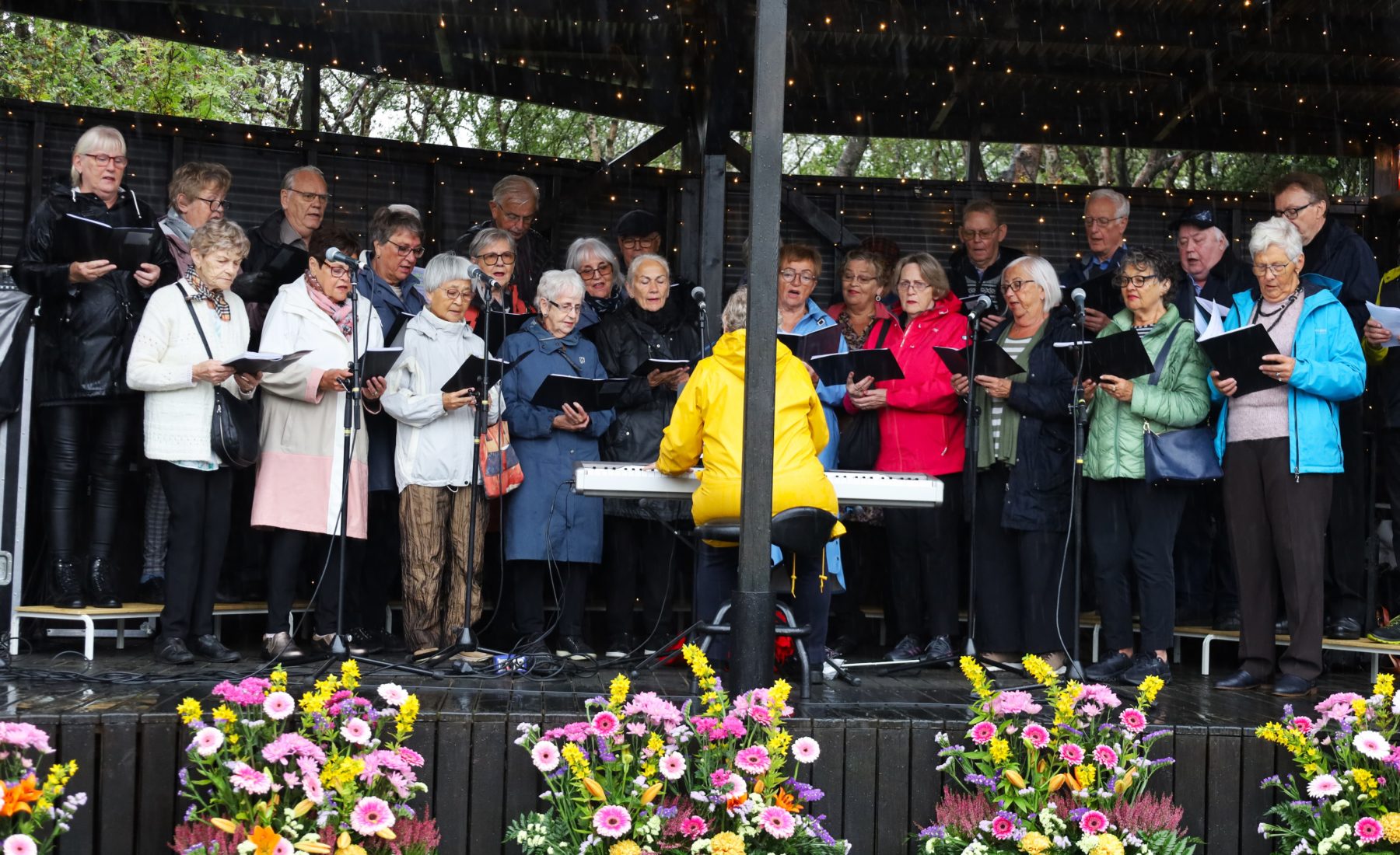 Það skiptust á skin og skúrir í Hellisgerði um helgina. Hafnarfjarðarbær fagnaði aldarafmæli Hellisgerðis á laugardag og á sunnudag blés Litla Álfabúðin til árlegrar Álfahátíðar í samstarfi við sveitarfélagið. Hraustir Hafnfirðingar létu úrhellisrigningu á aldarafmæli ekki stöðva sig og mættu prúðbúin til veislu með regnhlíf, hlýddu á ávarp bæjarstjóra og ljúfa tóna og tóku þátt í sögugöngum og spjalli um lífið í Hellisgerði síðustu áratugina. Meðal veislugesta voru þrjú systkini sem bjuggu í Hellisgerði. Tveir bræður sem fæddust í húsinu sem í dag hýsir Litlu Álfabúðina og systir sem flutti þangað tveggja ára gömul.
