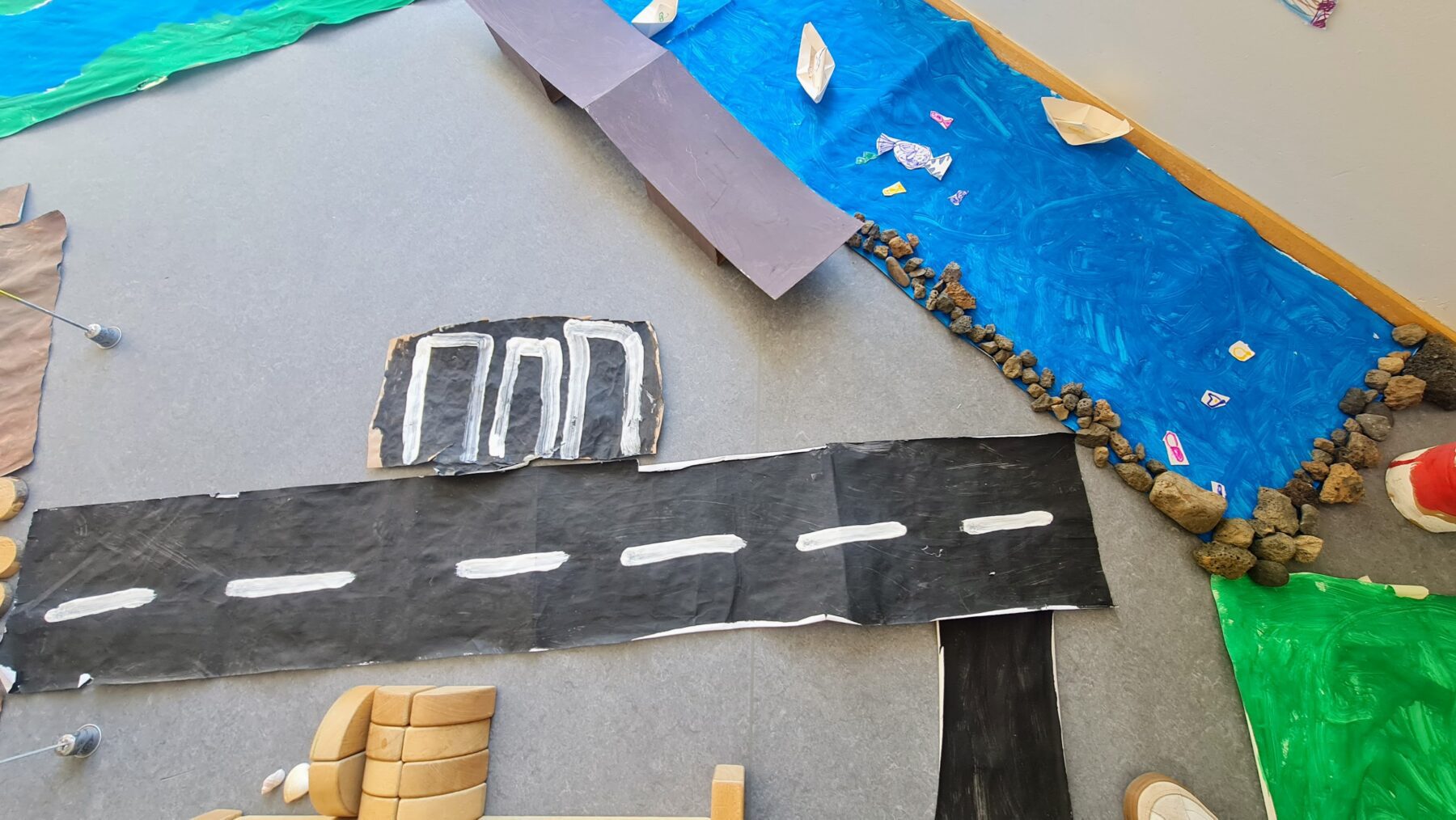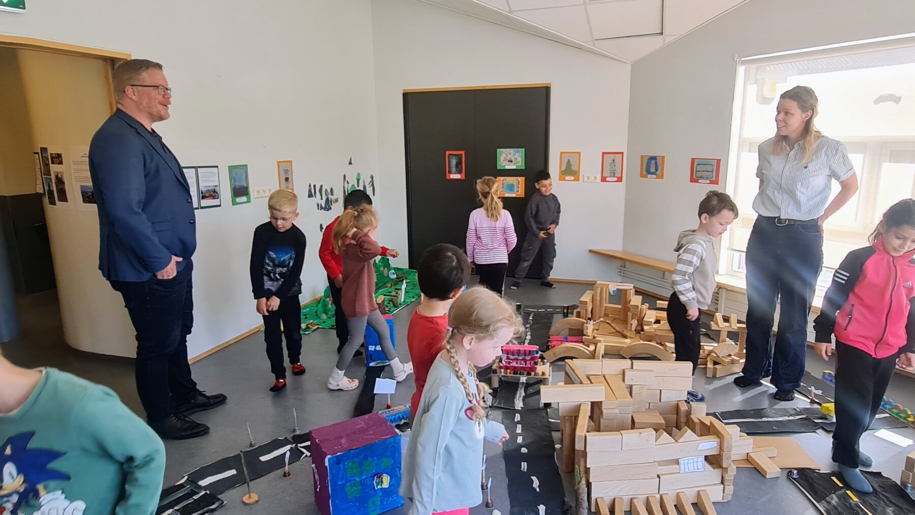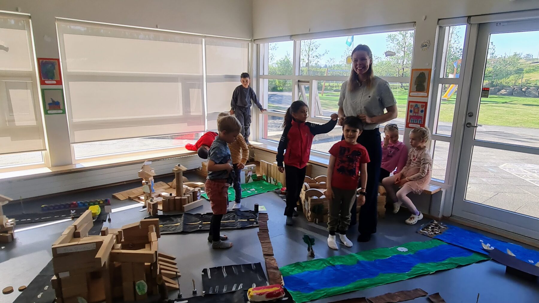 Útskriftarhópur barnanna á leikskólanum Hlíðarenda tók í morgun á móti bæjarstjóra og sýndi lokaverkefnið sitt, sérsniðinn bæ sem þakti allt gólf kennslustofunnar.