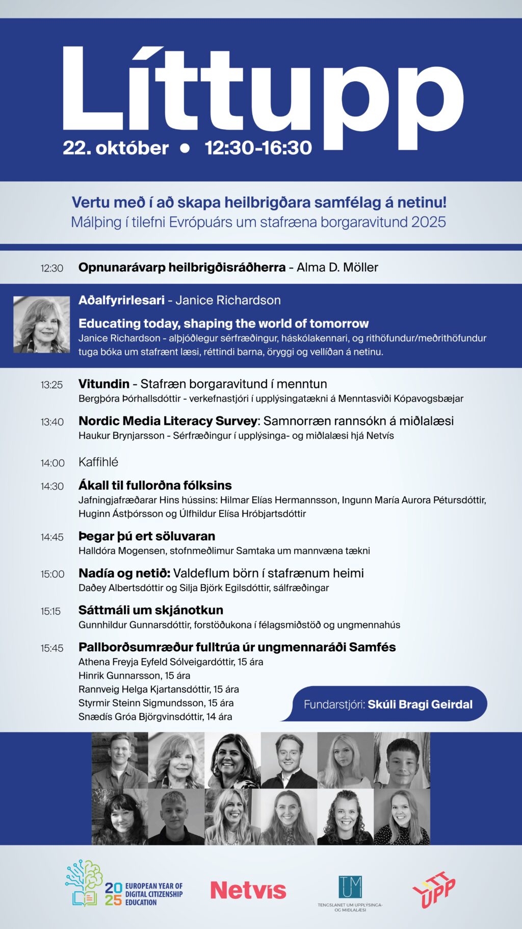„Líttu upp er opið öllum. Við hvetjum fólk til að skrá sig svo við getum áætlað veitingar í kaffihlé. Öll velkomin. Við hvetjum kennara og fagfólk til að mæta, en málþingið hentar öllu áhugasömu fullorðnu fólki,“ segir Unnur Freyja Víðisdóttir, sérfræðingur hjá Netvís – Netöryggismiðstöð Íslands.