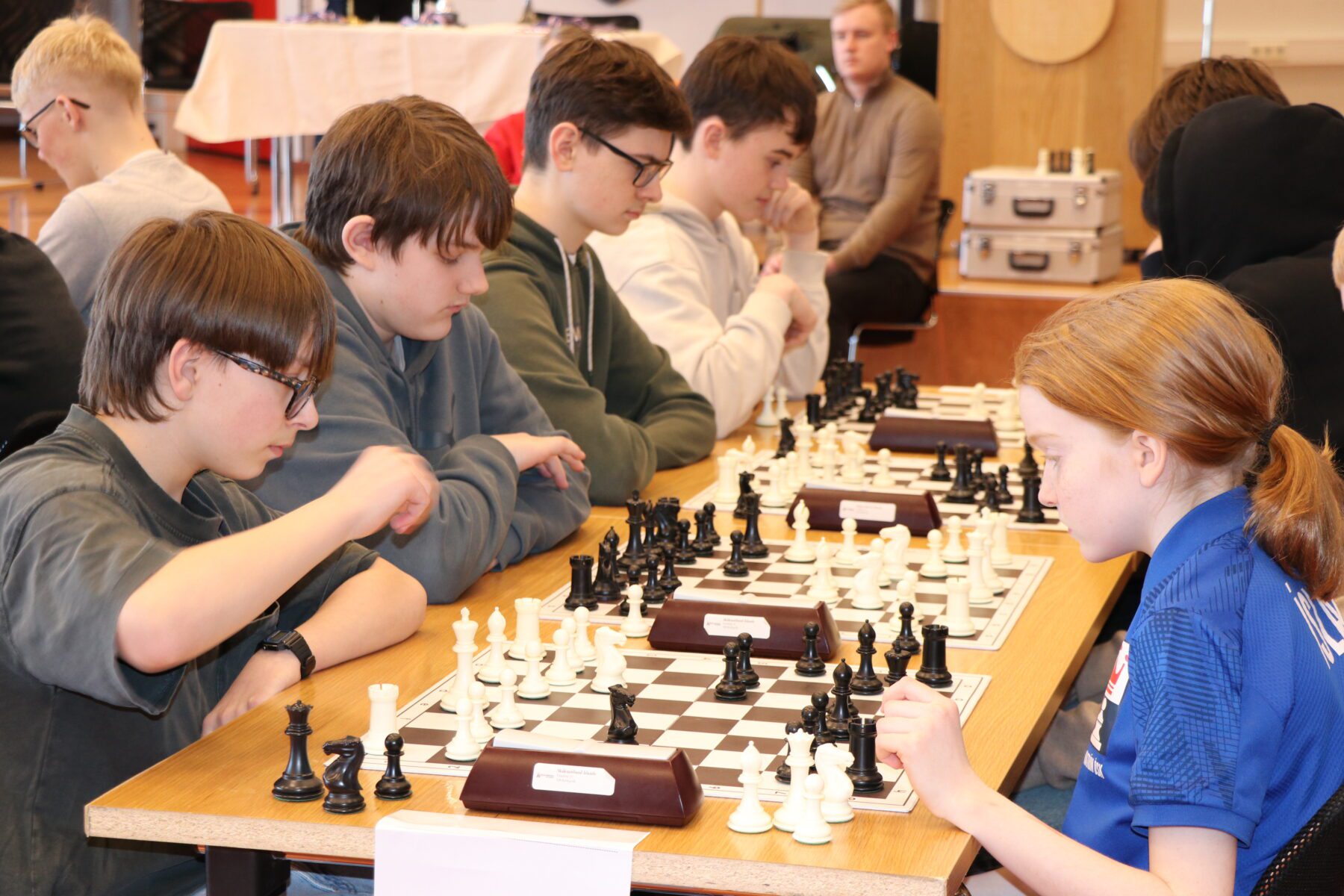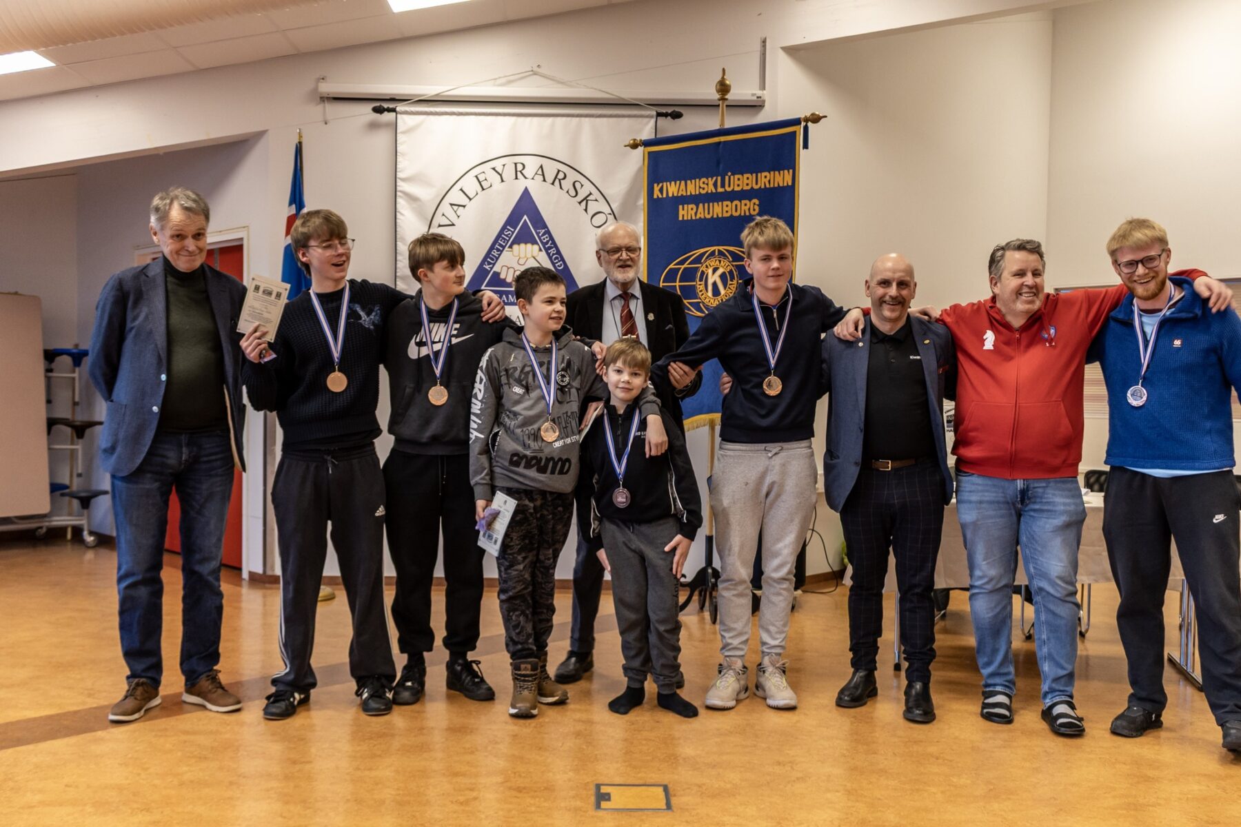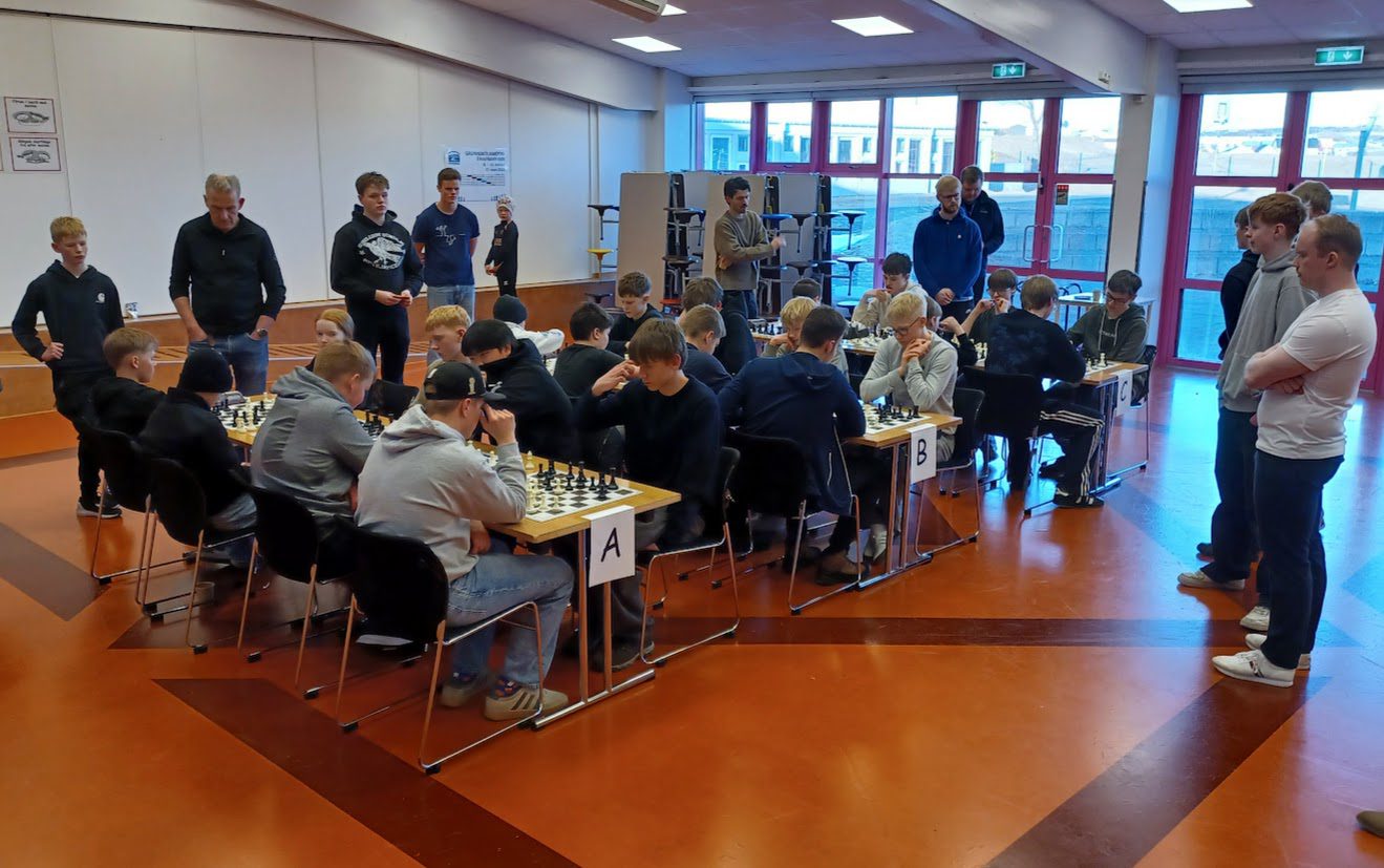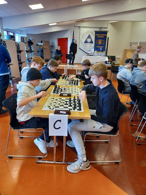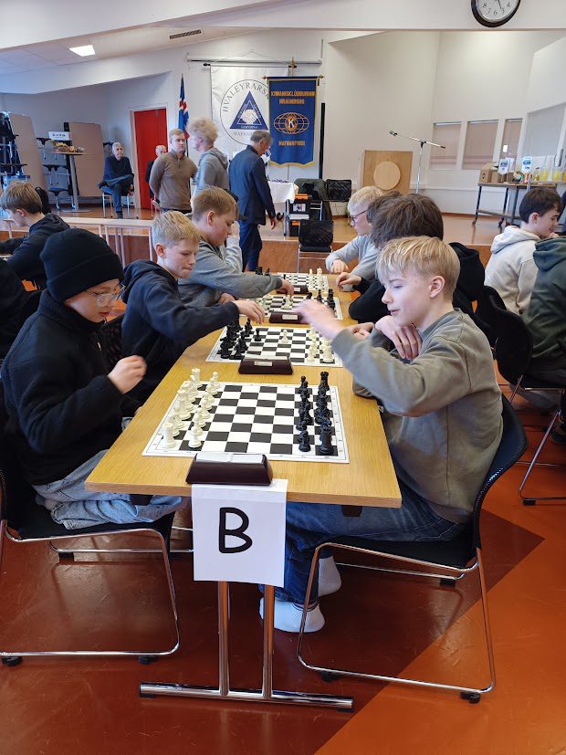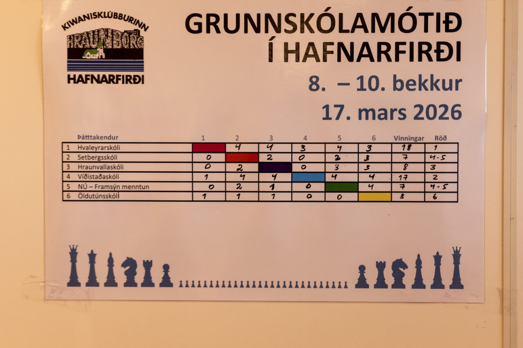 Skákmót 8.-10. bekkja grunnskóla Hafnarfjarðar fór fram í Hvaleyrarskóla síðdegis í gær. Skáksveitir frá 6 skólum, samtals 36 skákmenn og 12 liðsstjórar mættu til leiks. Ægir bauð keppendur velkomna fyrir hönd Hvaleyrarskóla. Mótið er samstarfsverkefni Kiwanisklúbbsins Hraunborgar og félagsmiðstöðva Grunnskólanna.