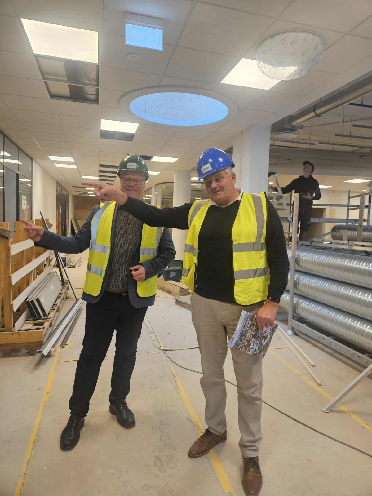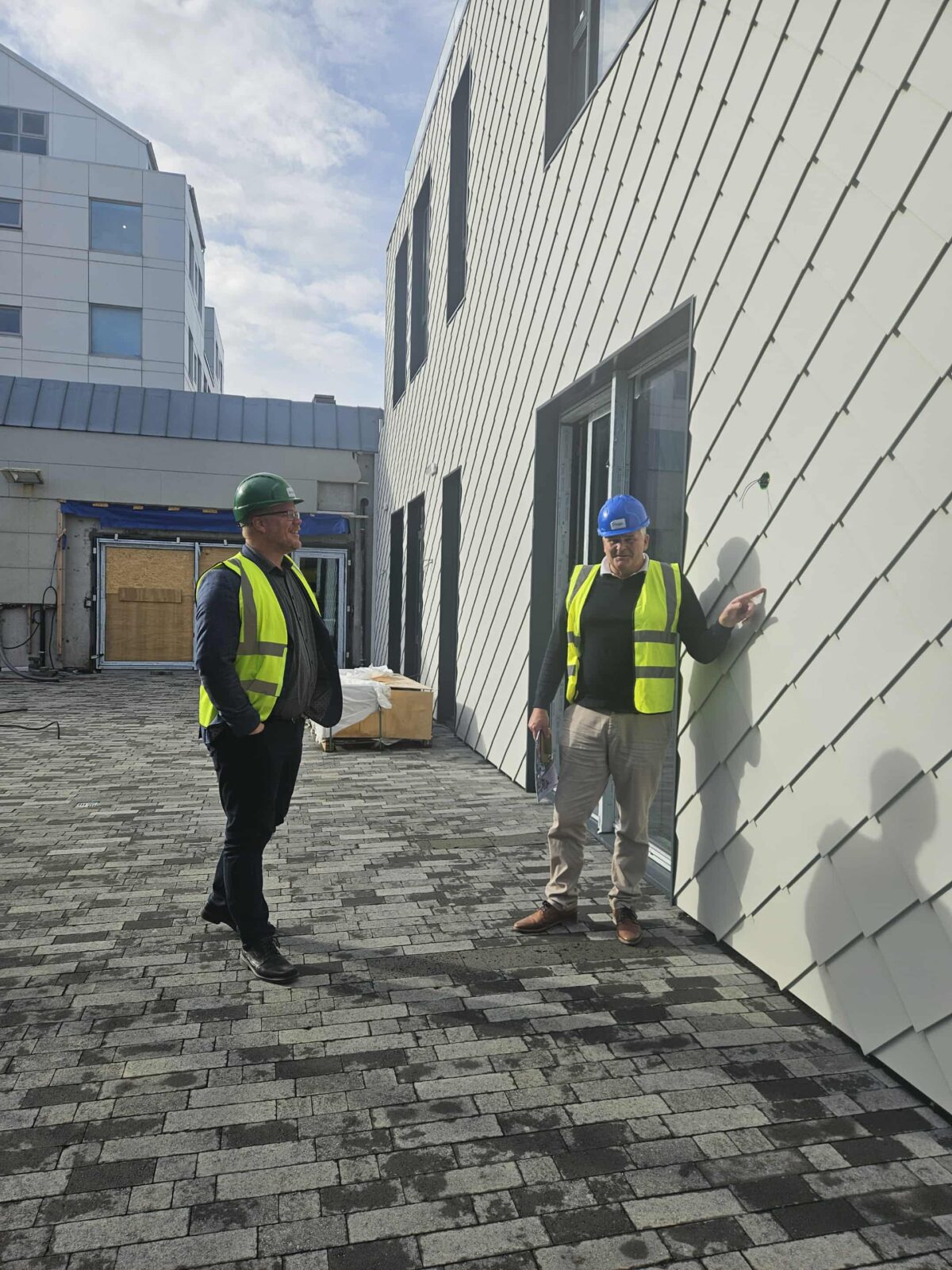 Guðmundur Bjarni Harðarson, framkvæmdastjóri Fjarðar, fylgdi bæjarstjóra um byggingarnar þennan dag. „Uppbyggingin gengur vel,“ segir hann. Áætlað er að verslunarkjarninn opni fyrir jól. Íbúðirnar eru nýkomnar í sölu og áhuginn er mikill. Við höfum aðeins haft þær í sölu í um hálfan mánuð og ég get sagt að salan fer vel af stað,“ lýsir hann.