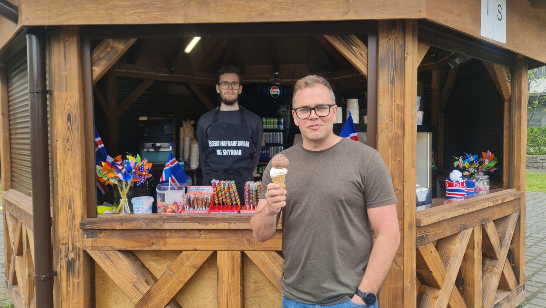 „Við búum allan ísinn til í Bæjarhrauni. Þar eru við með gelato-kúluís og þennan hefðbunda hvíta ís í bragðarrefi og brauðform. Við ákváðum að prófa að vera hér á Thorsplani í sumar og stefnum á að vera með opið alla daga frá 14-18,“ segir Björn Páll Fálki Valsson sem ásamt bróður sínum Grétari Þór eiga Ísgerð Hafnarfjarðar. Hann segir að leiki veðrið hins vegar við fjörðinn fagra opni turninn fyrr eða lengur.