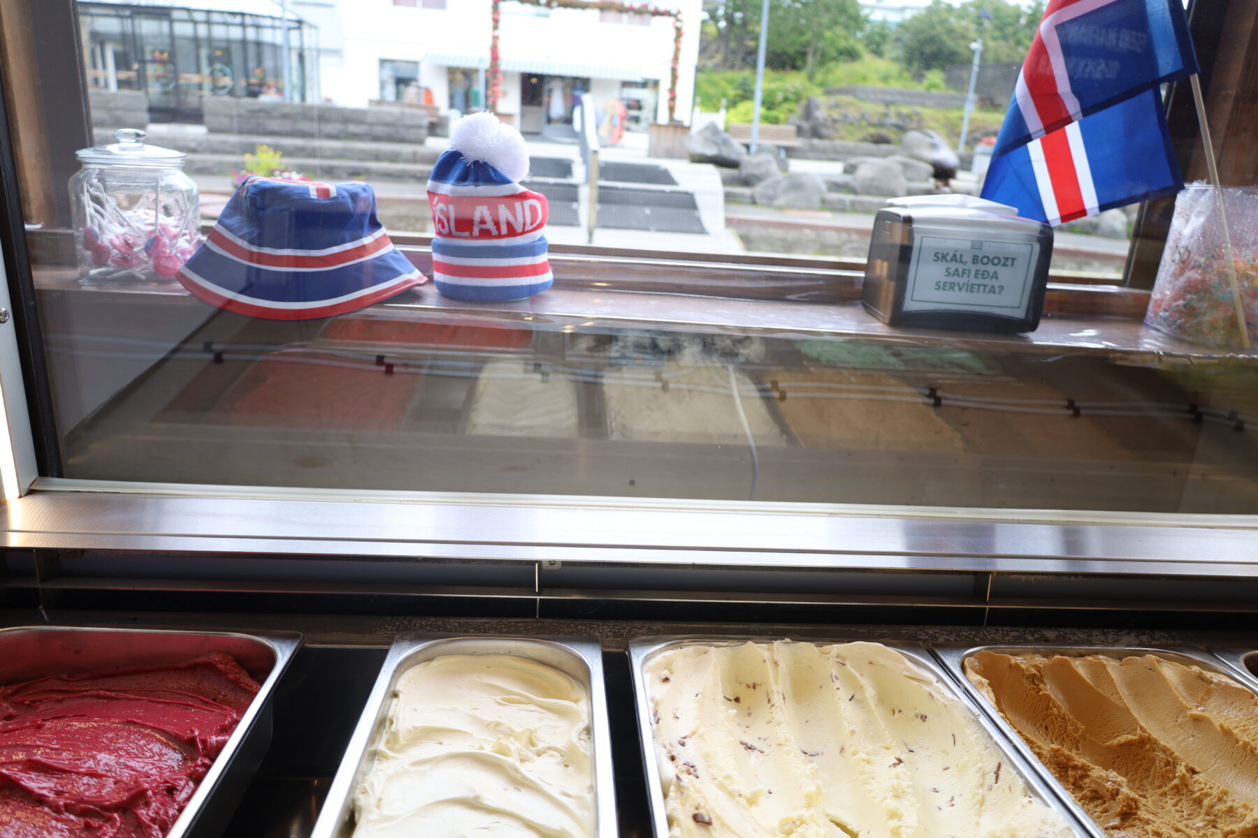 „Við höfum líka prófað þegar Hjarta Hafnarfjarðar var að opna að hafa opið til rúmlega 21. En hingað kemur aðallega fólk sem röltir framhjá, sér ísbúðina og vill prófa.“ Þótt ísinn leiki aðalhlutverkið er einnig hægt að fá gos, nammi og pylsu eins og góðum söluturni sæmir.