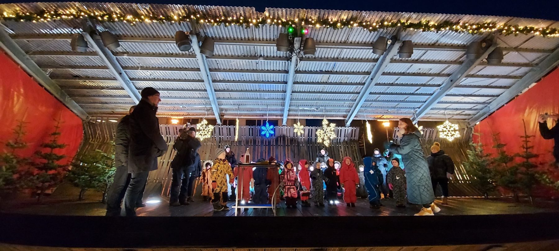 Ljósin á Cuxhaven-jólatrénu voru tendruð í Jólaþorpinu í Hafnarfirði í morgunsárið að viðstöddum leikskólabörnum og starfsfólki frá Hjalla, Rósu Guðbjartsdóttur bæjarstjóra Hafnarfjarðar, Christian Stepper staðgengli sendiherra Þýskalands á Íslandi og Gísla Valdimarssyni formanni vinabæjarfélagsins Hafnarfjörður-Cuxhaven.