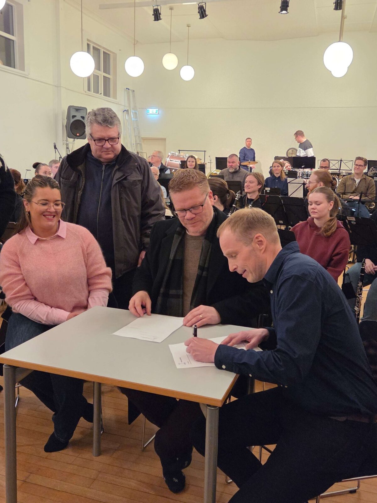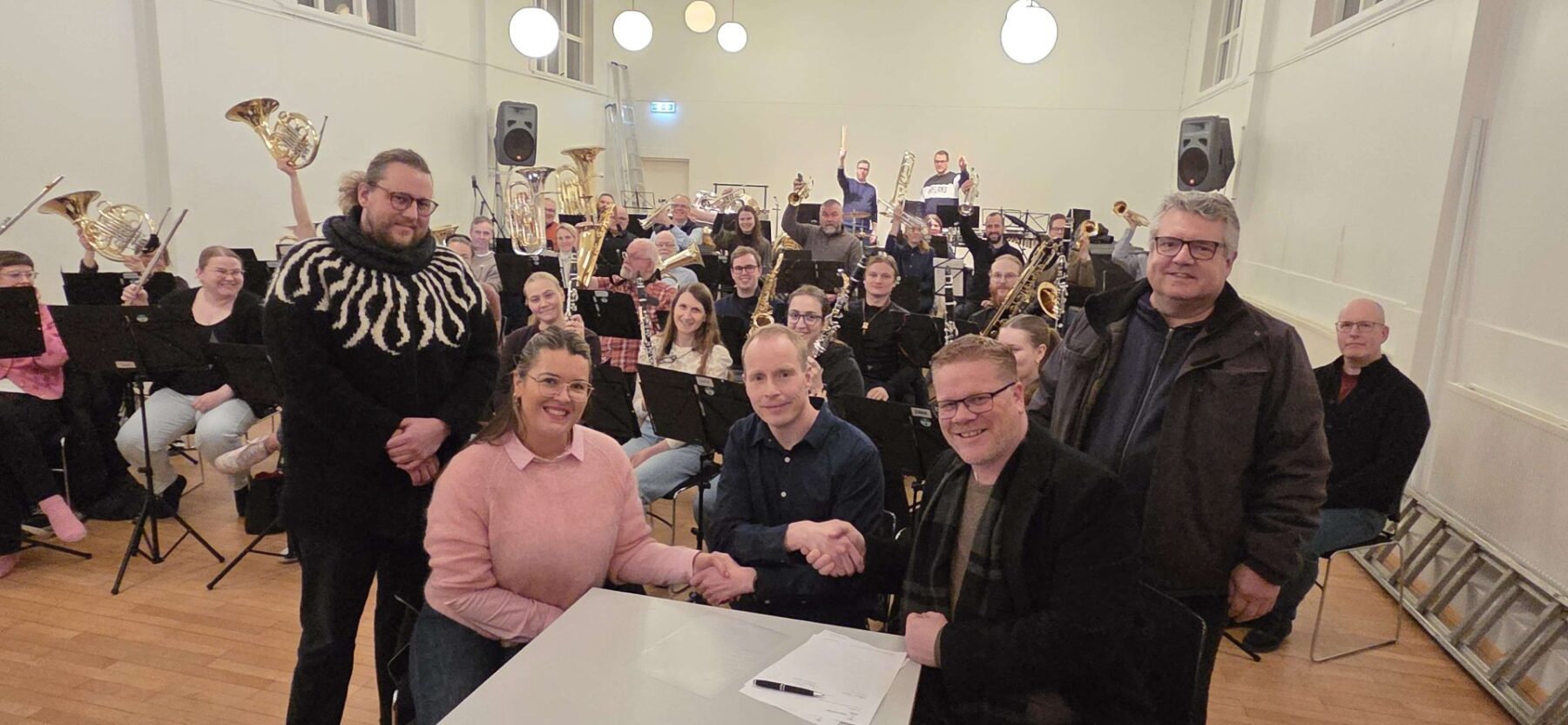 Lúðrasveit Hafnarfjarðarbæjar fær eina milljón króna árlega í styrk frá bænum næstu fimm árin. Markmiðið er að styðja við reglubundna starfsemi sveitarinnar og efla lúðrasveitastarf og menningarlíf í Hafnarfirði. Bæjarstjóri og formaður lúðrasveitarinnar rituðu undir samninginn að sveitinni viðstaddri og tók hún lagið. Stemningin var afar góð.