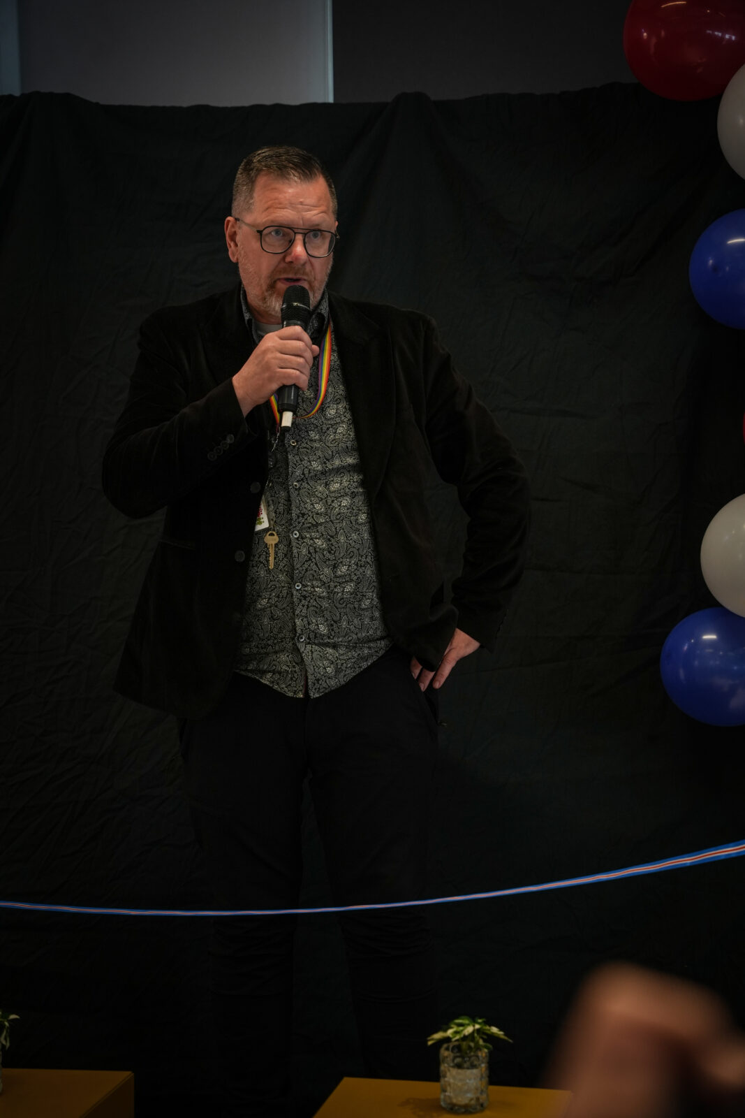 Nýsköpunarsetrið við Lækinn var formlega opnað eftir uppfærslu og endurbætur síðdegis í gær. Mannmargt var í húsinu og líf og fjör í hverju horni. Valdimar Víðisson klippti á borða. Táknrænt fyrir endurgerða Nýsköpunarmiðstöðina.