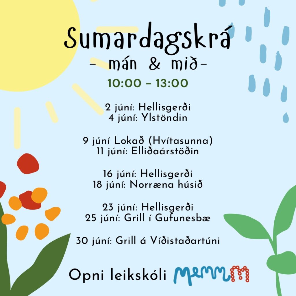 Opni leikskóli Memmm hefur tekið upp sumardagskrá. Hægt er að mæta víða í Hafnarfirði og Reykjavík tvisvar í viku. Skólinn verður bæði í Hellisgerði og á Víðistaðatúni.