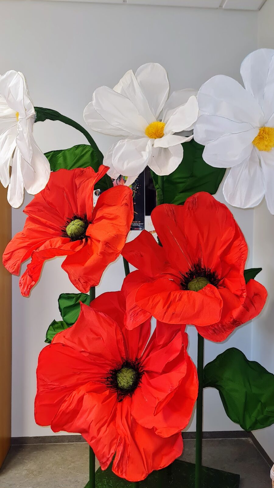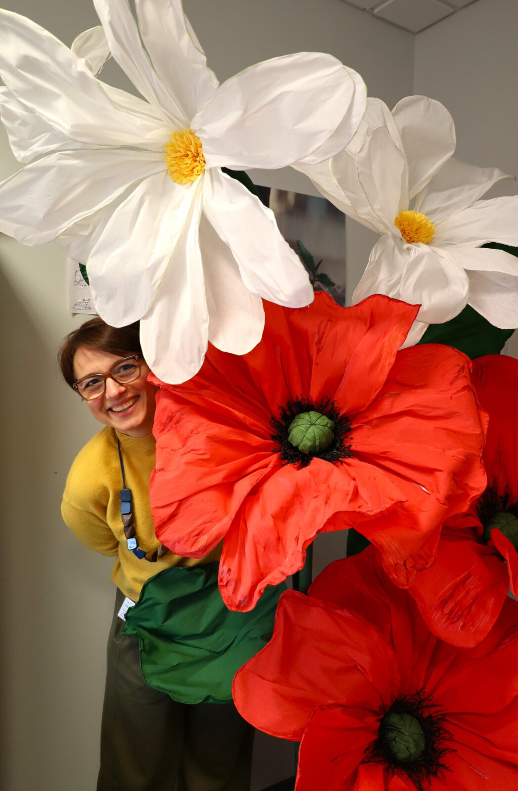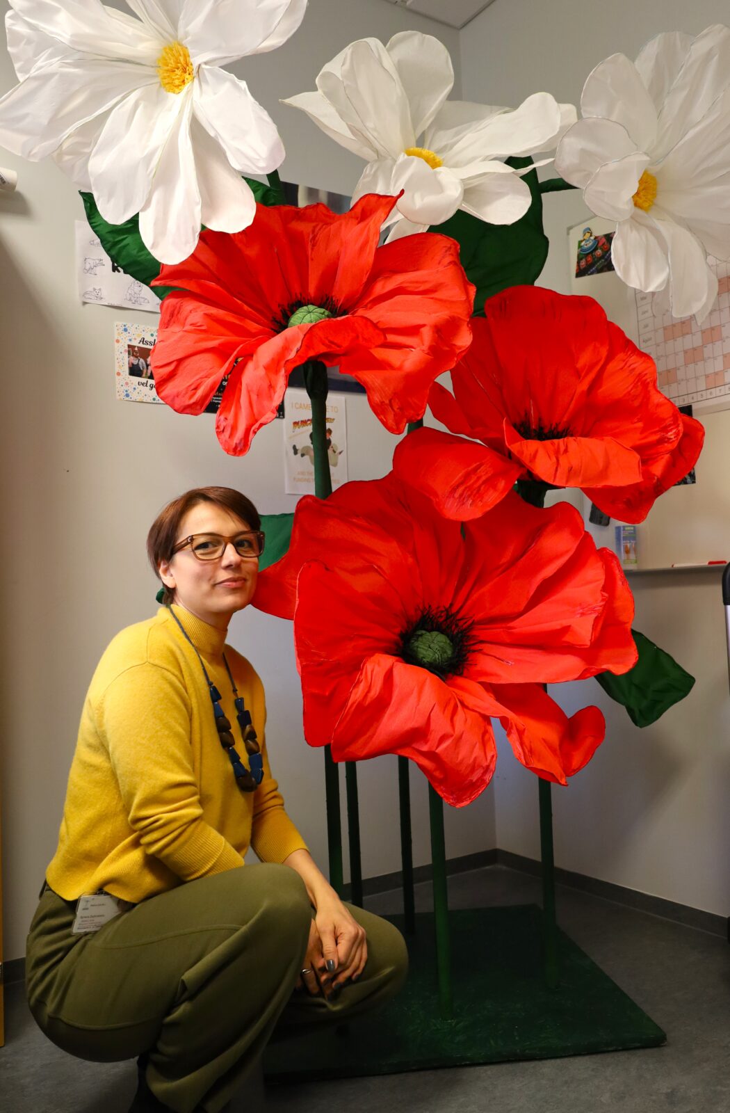 Sjálf gerði Sylwia listaverk fyrir daginn. Risablóm úr kreppappír sem hún stendur hjá á myndinni. „Já, það tók sinn tíma. En þetta er eitt af því sem ég elska að gera.“