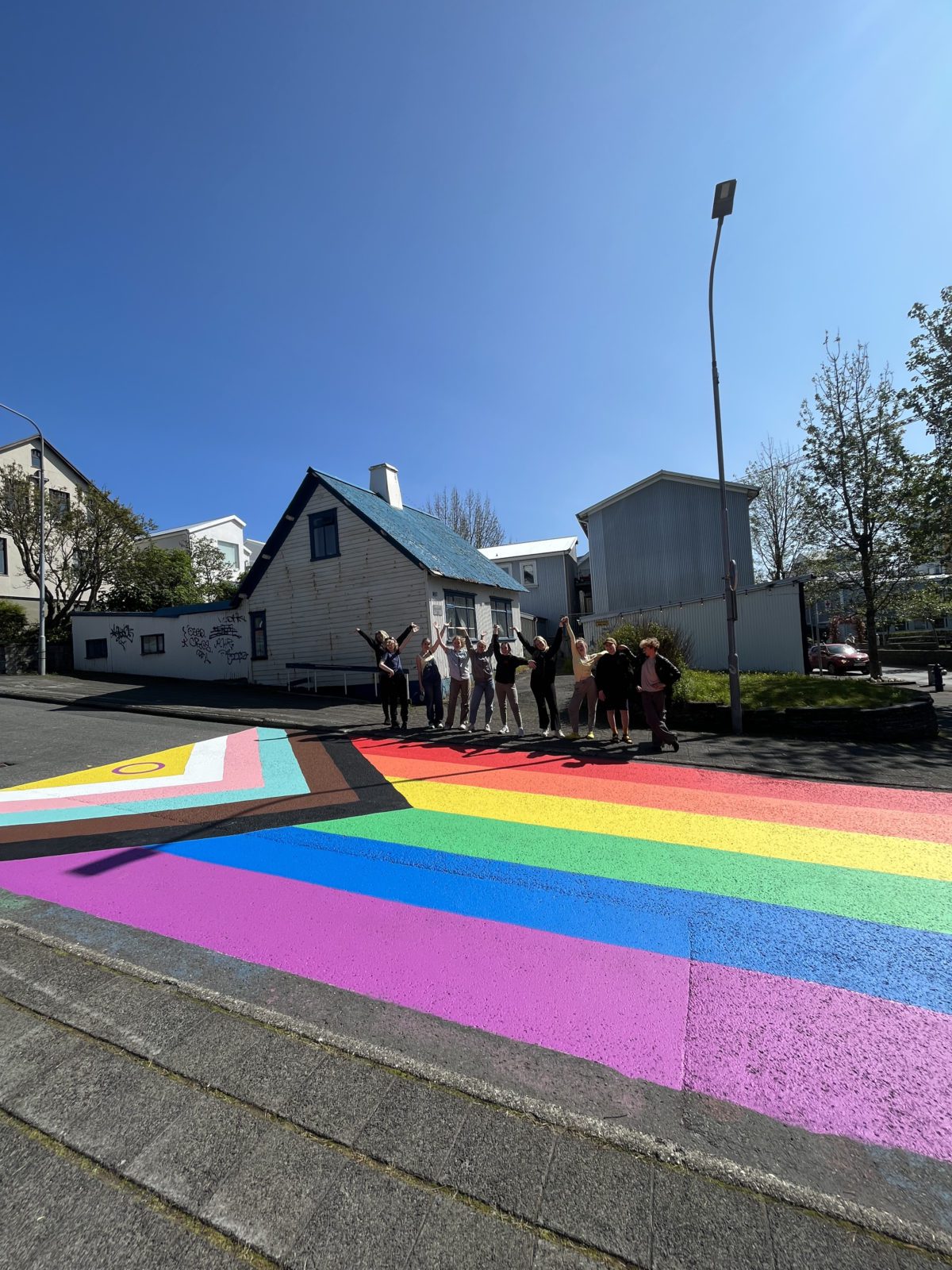 Listahópur vinnuskólans lauk við að mála pride fánann á Linnetsstíginn í gær.