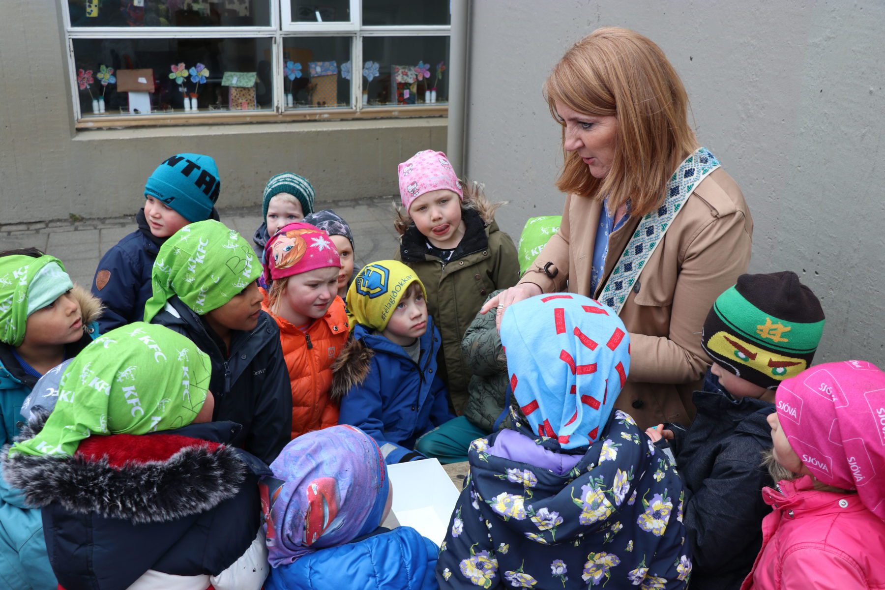 Rósa Guðbjartsdóttir bæjarstjóri Hafnarfjarðar heimsótti elstu nemendur í heilsueflandi leikskólanum Smáralundi og færði þeim fræ til ræktunar.