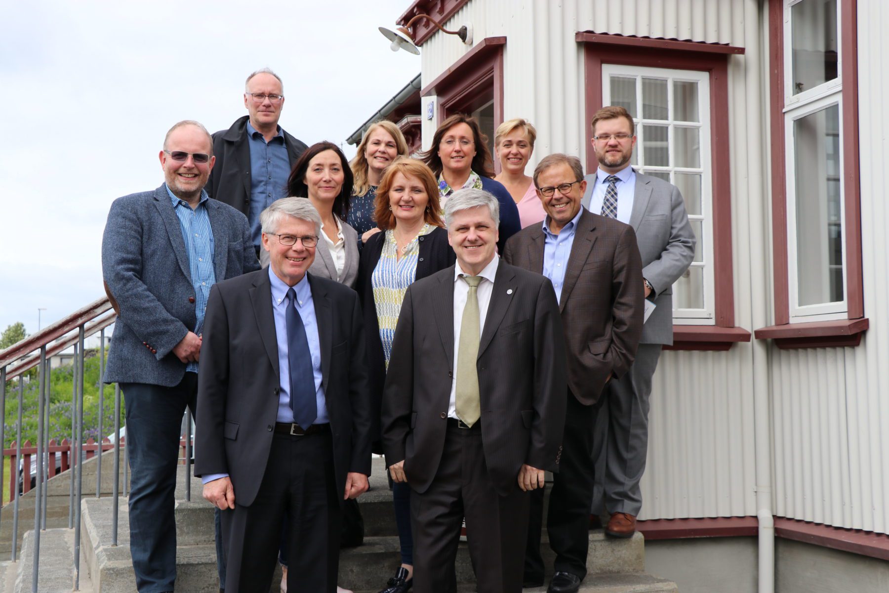 Bæjarfulltrúar Hafnarfjarðarbæjar og fulltrúar fjármála- og efnahagsráðuneytis hér með ráðherra og bæjarstjóra fyrir utan Bookless Bungalow eftir undirritun kaupsamnings.