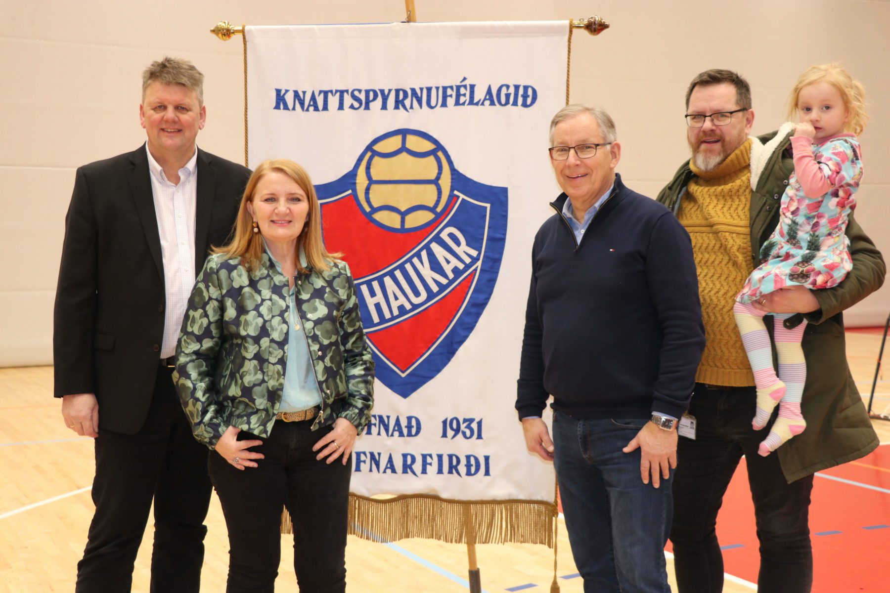 Rósa Guðbjartsdóttir, bæjarstjóri, og Samúel Guðmundsson, formaður Hauka, skrifuðu undir samkomulagið í hinum glæsilega Ólafssal ásamt Geir Bjarnasyni, íþrótta- og tómstundarfulltrúa bæjarins, og Magnúsi Gunnarssyni, framkvæmdastjóra Hauka.