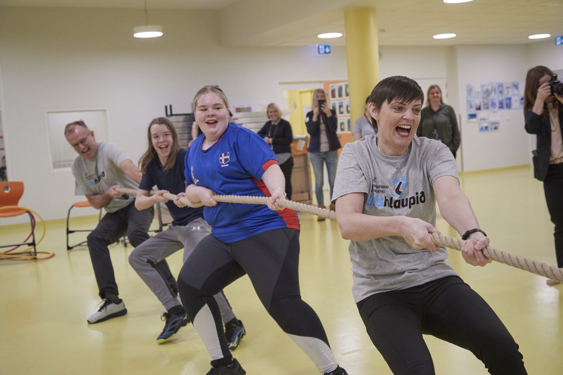 Mikil gleði ríkti í Skarðshlíðarskóla í morgun þegar Lífshlaupið var ræst í þrettánda sinn. Ingibjörg Magnúsdóttir skólastýra bauð gesti velkomna. Rósa Guðbjartsdóttir, bæjarstjóri og Þráinn Hafsteinsson, formaður Almenningsíþróttasviðs ÍSÍ ávörpuðu svo gesti áður en þau kepptu í skemmtilegum þrautum sem Ana og Viktor, íþróttakennarar skólans stýrðu af mikilli snilld. Blossi, lukkudýr ÍSÍ mætti á svæðið öllum til mikillar ánægju. Þegar að dagskrá lauk drifu nemendur og kennarar sig út og hlupu míluna sína.