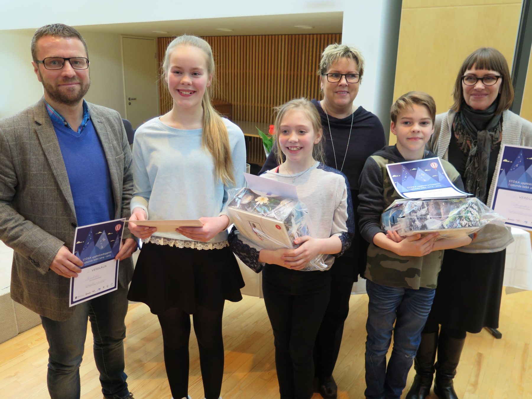 Sigurvegarar minni mynd, Eygló í miðjunni. Sigurvegar hér neðar ásamt skólastjórum sínum.