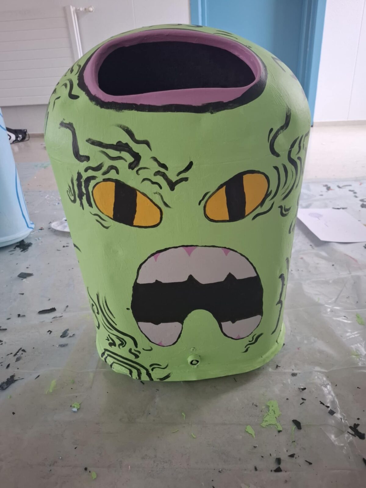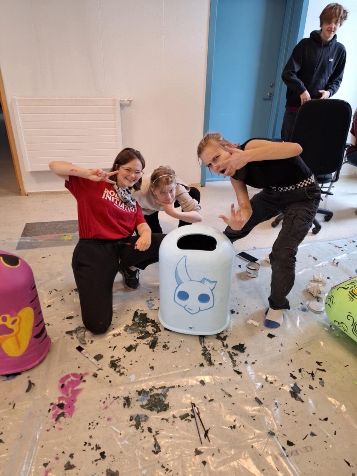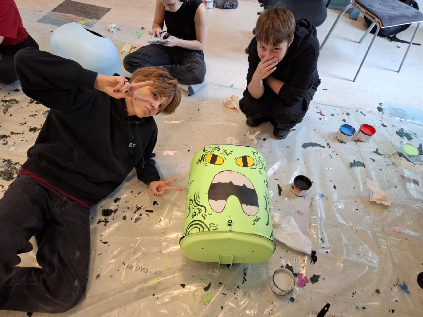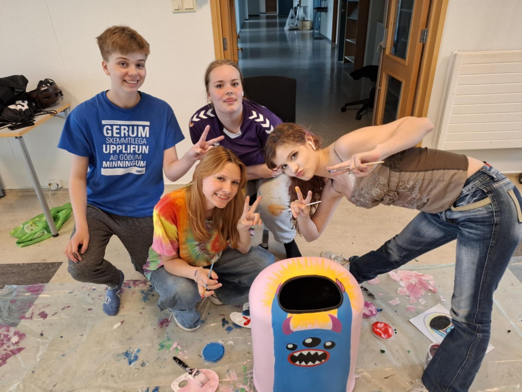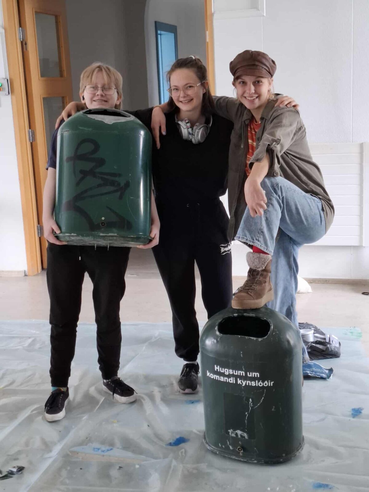 „Við vonum svo að þegar fólk hendir rusli í þessi skapandi ruslaskrímsli hugsi það um umhverfið.“ En, hvenær fara tunnurnar upp? „Við stefnum á að þær fari upp næstu daga,“ segir Diljá og hvetur ungt fólk til að kynna sér listhópinn og aðra innan vinnuskólans og sækja um fyrir næstu ár.