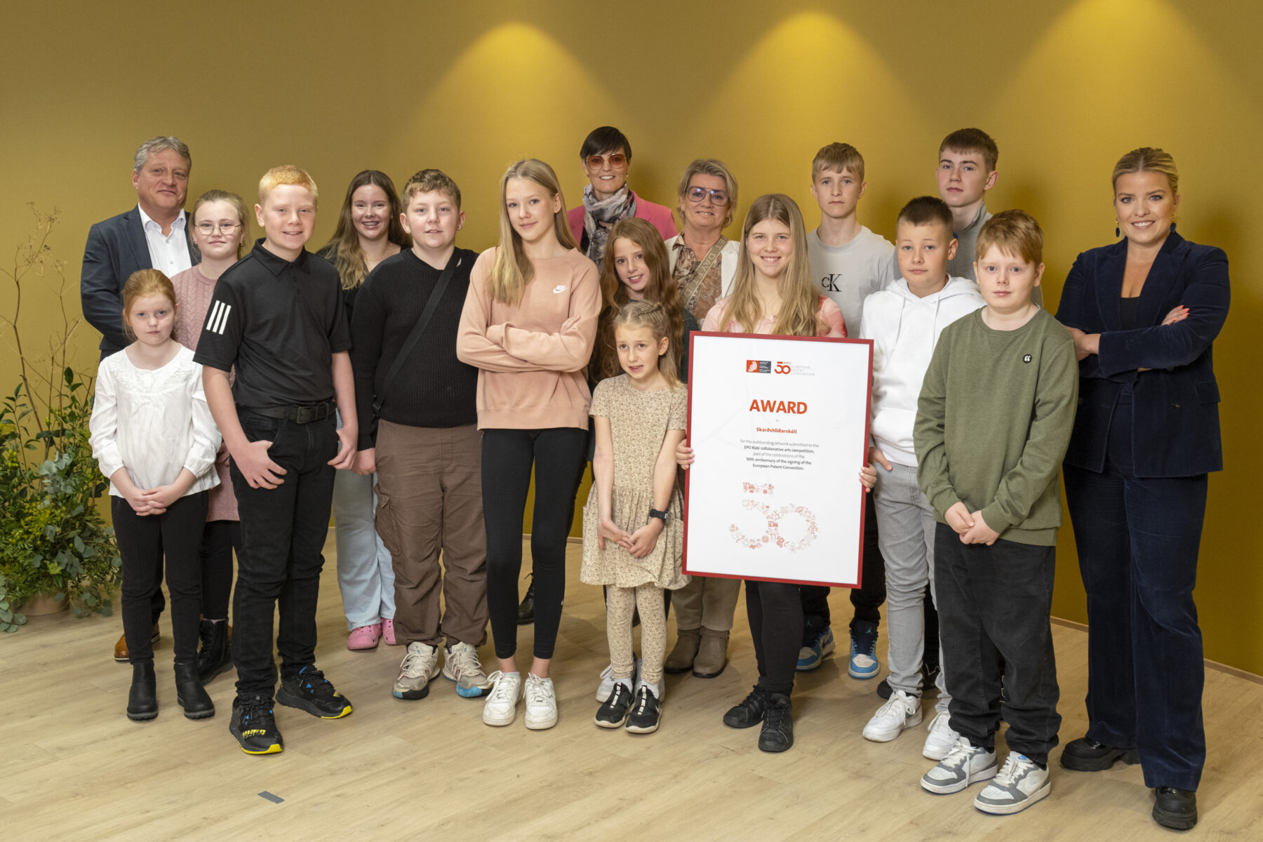 Nemendur Skarðshlíðarskóla í Hafnarfirði eru meðal sigurvegara í listaverkasamkeppni Evrópsku einkaleyfastofunnar (European Patent Office, EPO) sem haldin var í tilefni þess að 50 ár eru liðin frá undirritun evrópska einkaleyfasamningsins. Verðlaun til íslensku sigurvegaranna voru afhent við hátíðlega athöfn hjá Hugverkastofunni í morgun að viðstöddum nokkum nemendur, foreldrum og starfsfólki skólans. Þau voru þar í góðum félagsskap Ursulu von der Leyen, forseta framkvæmdastjórnar Evrópusambandsins, hans hátignar Willem-Alexander, konungs Hollands, Olaf Scholz, kanslara Þýskalands, Áslaugar Örnu Sigurbjörnsdóttur, háskóla-, iðnaðar- og nýsköpunarráðherra og fleiri.
