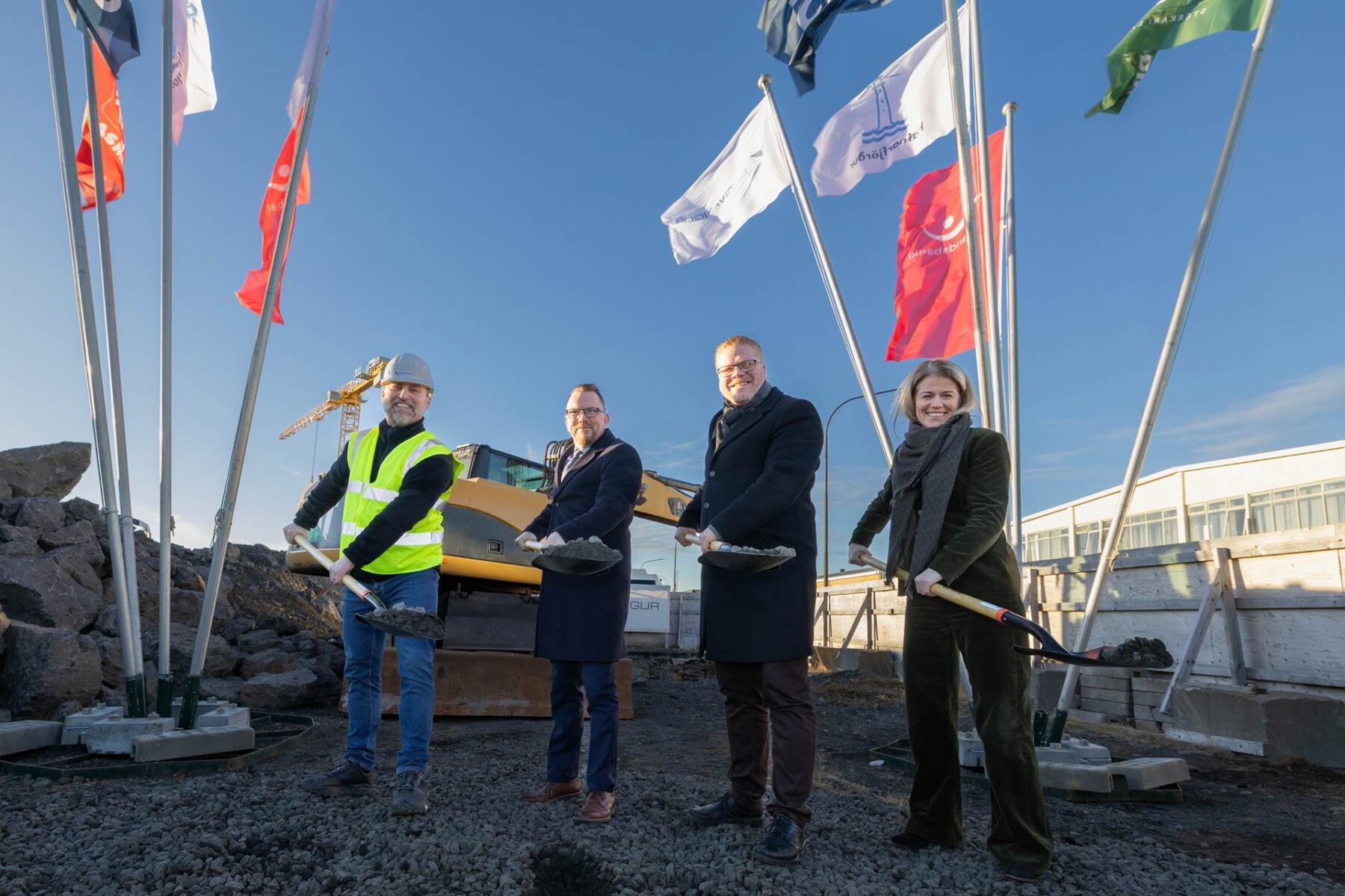 Ragnar Þór Ingólfsson, félags- og húsnæðismálaráðherra, Pálmar Harðarson, framkvæmdastjóri Þingvangs, Valdimar Víðisson, bæjarstjóri Hafnarfjarðar og Kristín Hrönn Guðmundsdóttir, framkvæmdastjóri hjá Íslandsbanka, tóku skóflustunguna síðdegis í gær.