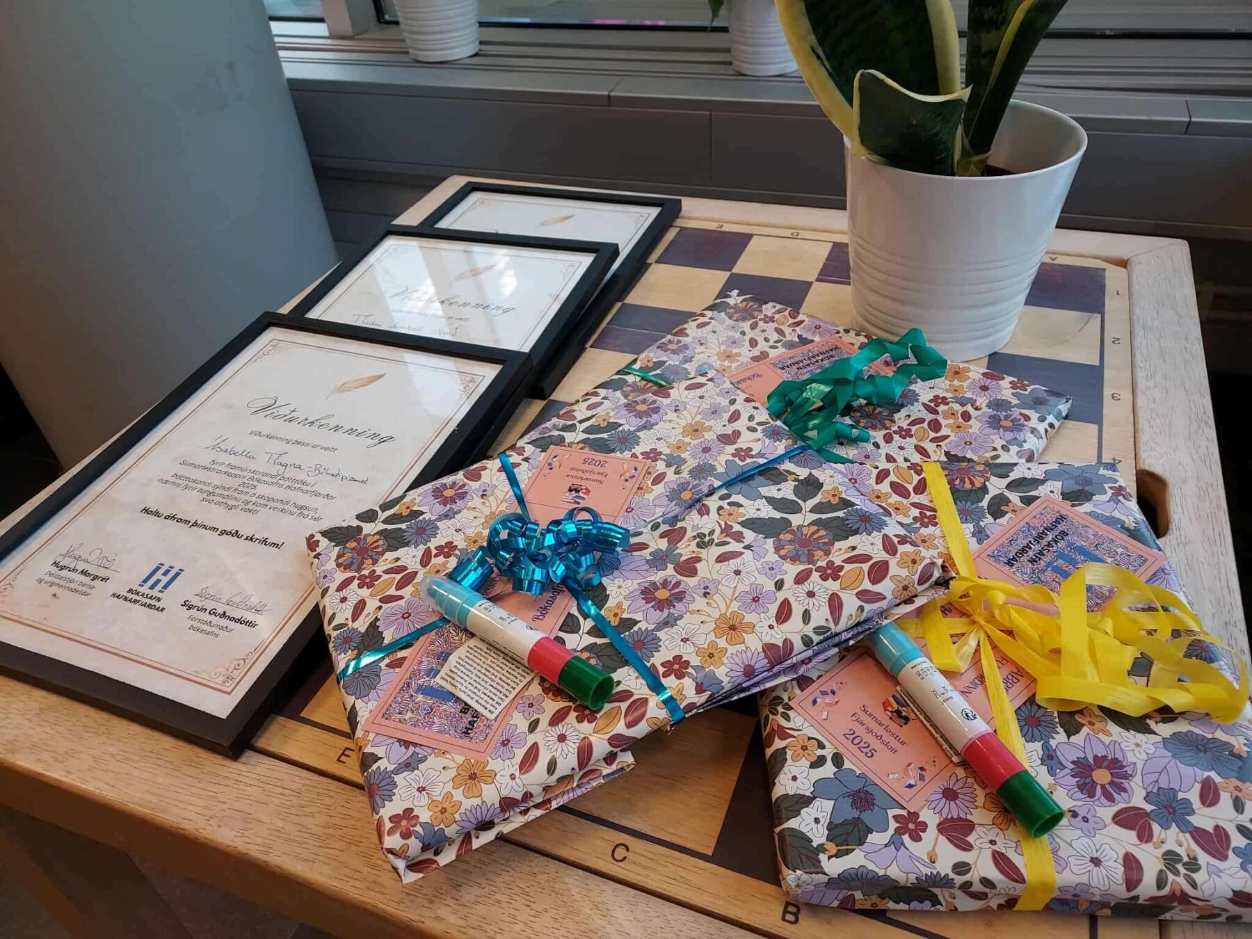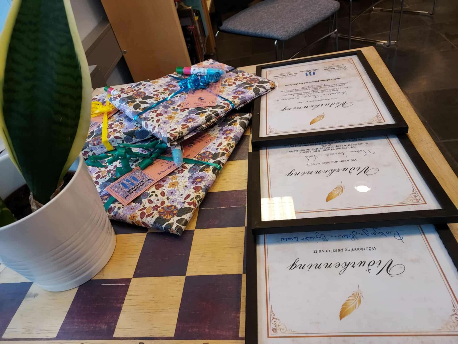 Athöfnin var afar hlýleg og lágstemmd á Bókasafninu. Þar komu fjölskyldur vinningshafa saman sem og starfsfólk bókasafnsins og fögnuðu uppskerunni.