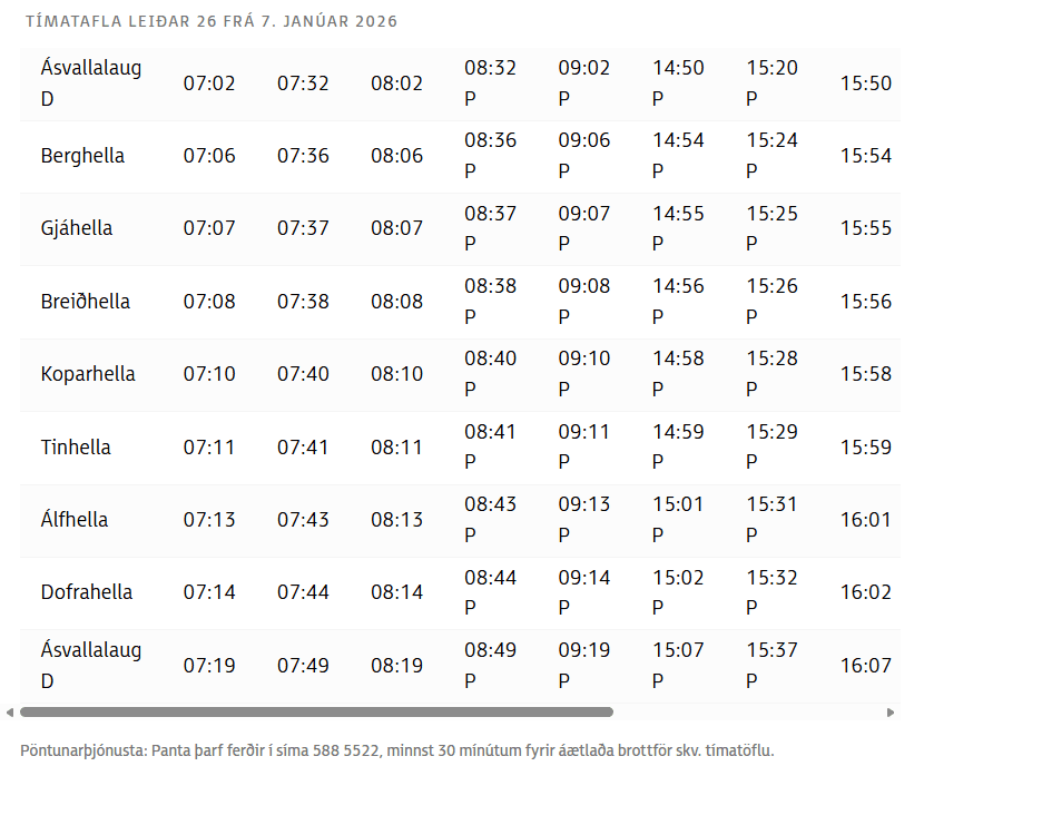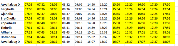 Prosimy o zwrócenie uwagi, że przystanki Berghella, Breiðhella, Gjáhella i Álfhella zostaną nieznacznie przeniesione.