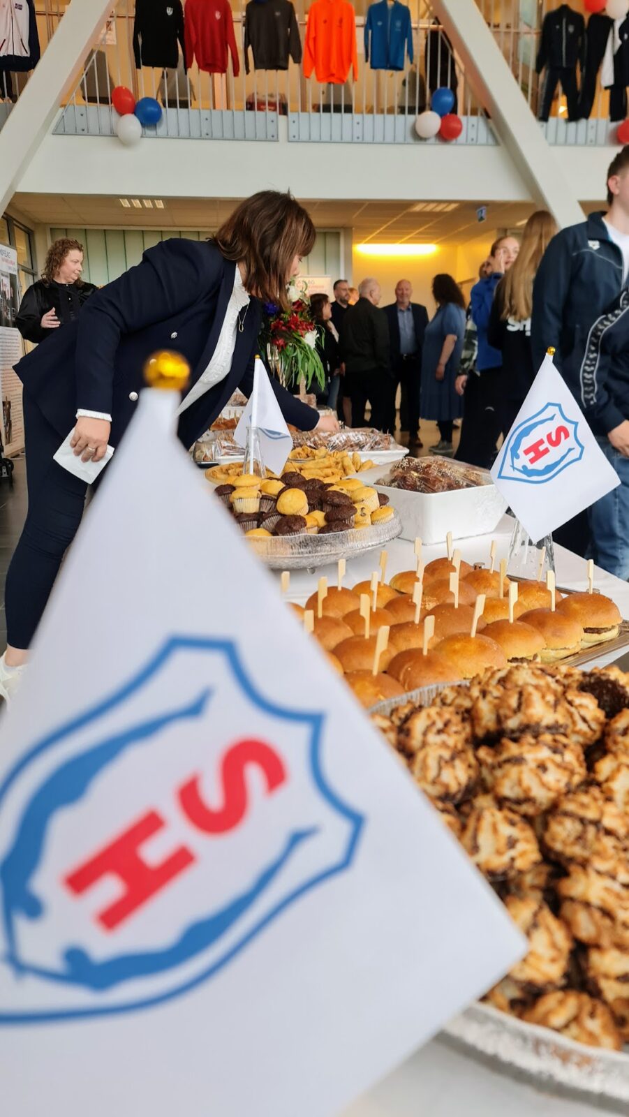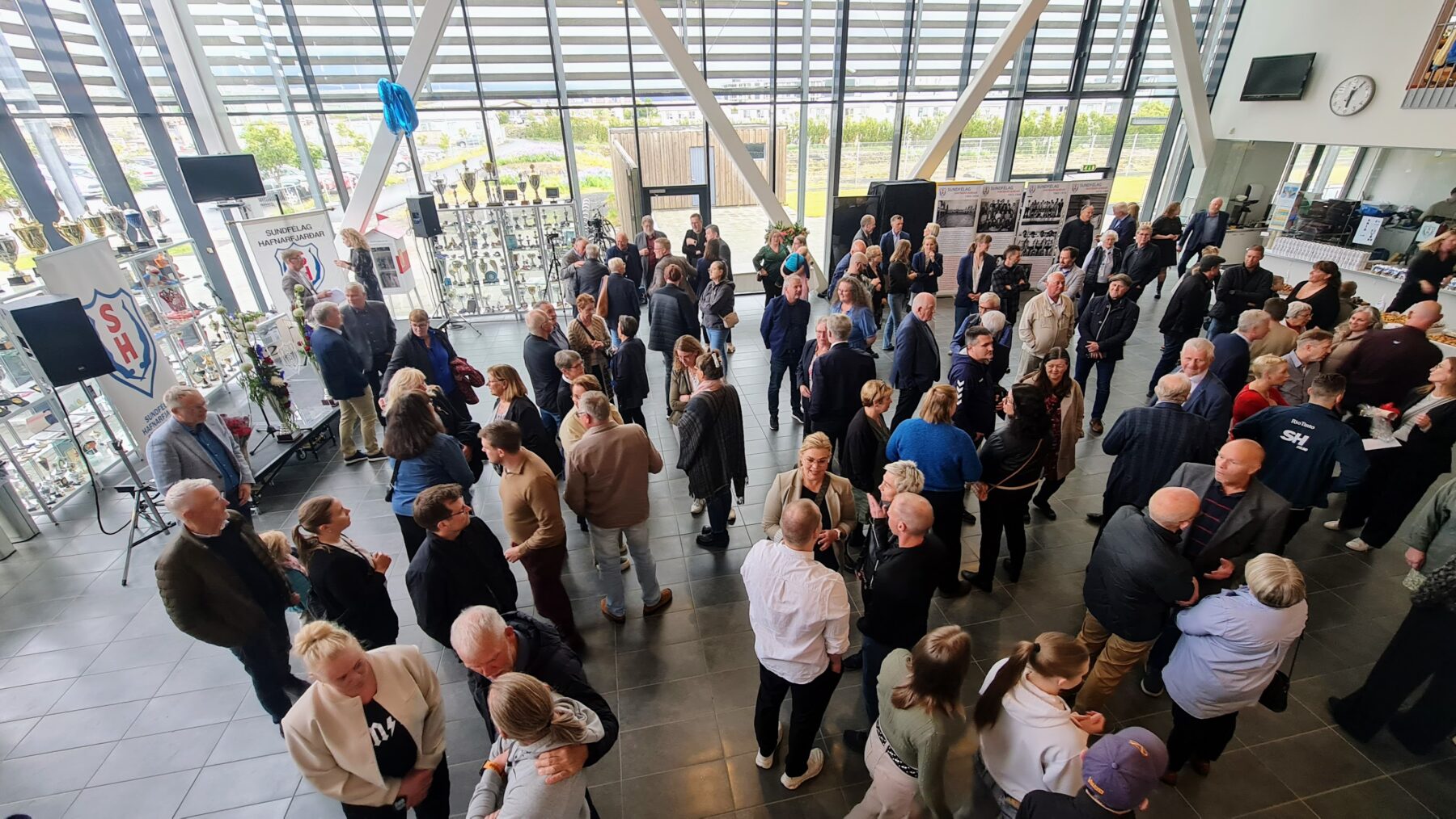 Ekki aðeins stóð anddyri Ásvallarlaugar fullt á þessum afmælisfögnuði heldur skoðaði fjöldi einnig frábæra sýningu félagsins í sal á efri hæðinni. Sýningin er opin fram yfir næstu helgi. Þar má sjá bikara, myndir og annan varning úr langri sögu félagsins.