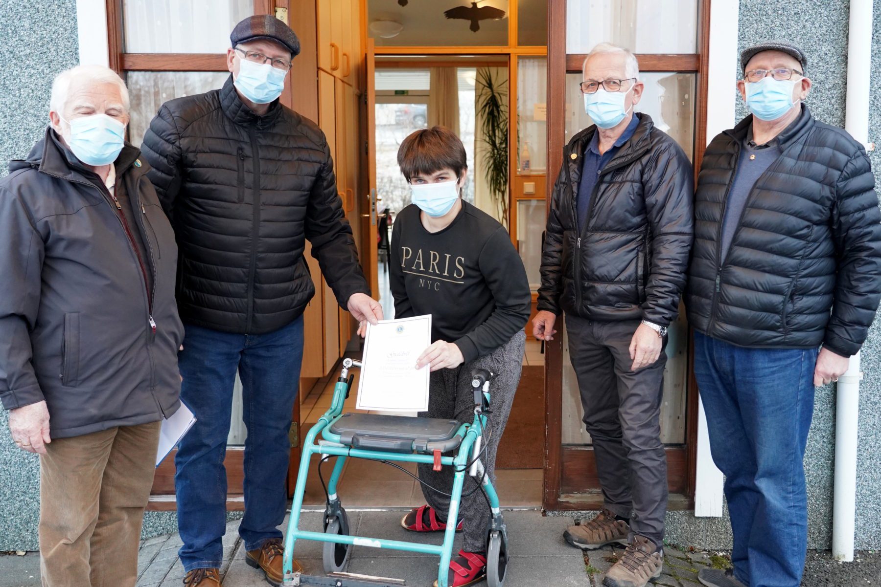 Fulltrúar frá Lionsklúbbnum Ásbirni fyrir utan Steinahlíðina með alsælum íbúa.