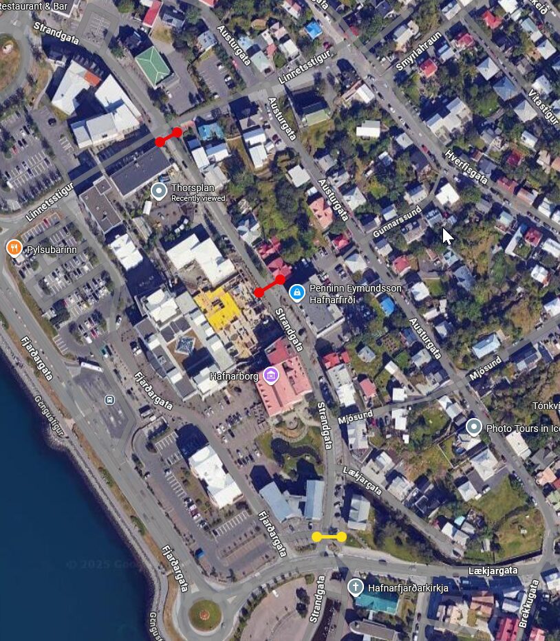 Strandgötu verður tímabundið lokað vegna viðburðar á Thorsplani milli kl.16:45 og 18:15 þriðjudaginn 6. janúar. Þungar lokanir verða við Linnetsstíg og Strandgötu 29 (rautt á mynd), létt lokun verður við Lækjargötu (gult á mynd).