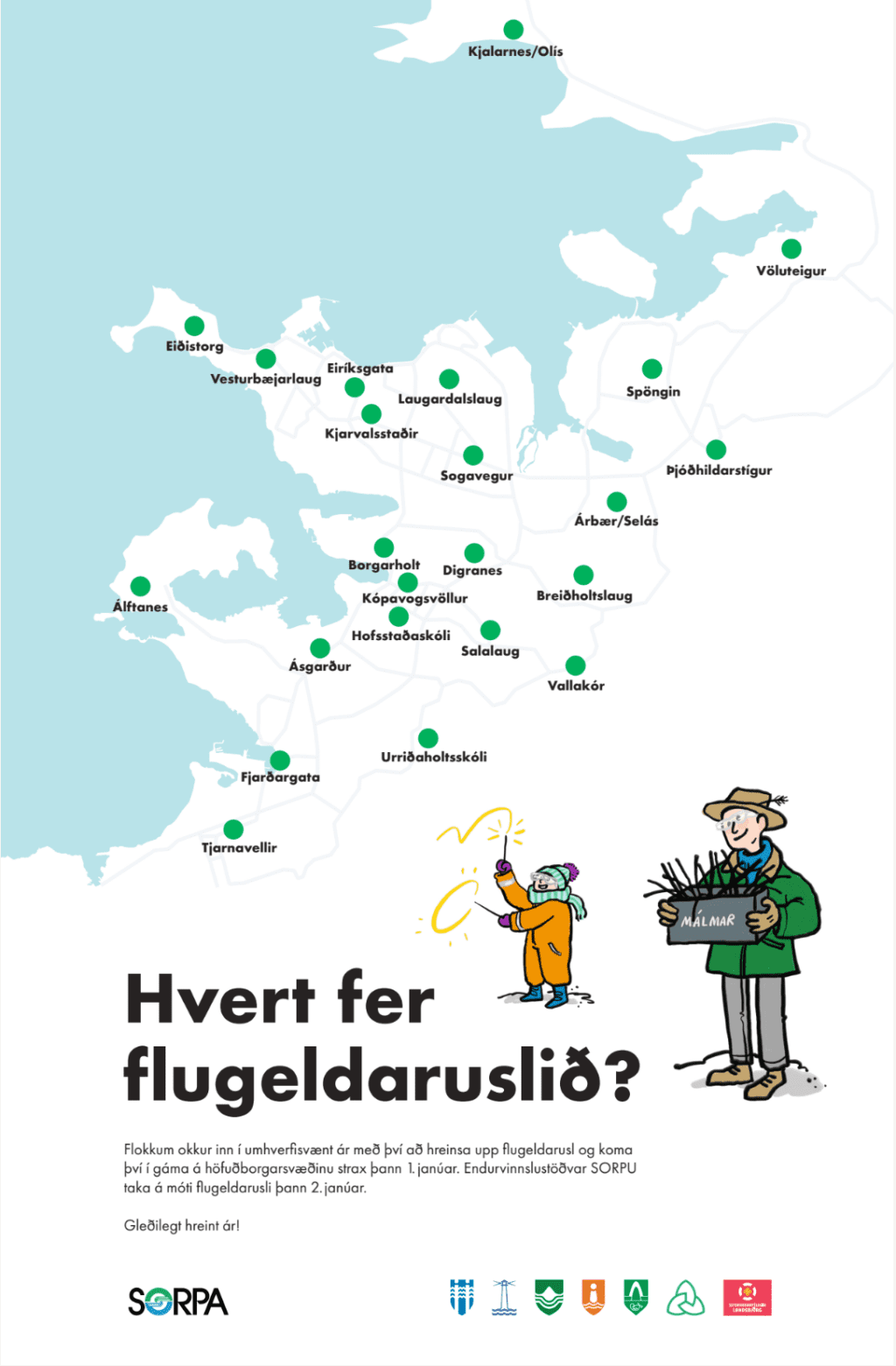 Eftir áramótin er flugeldarusl oft áberandi í bænum. Brýnt er að koma þessu rusli á endurvinnslustöðvar, því það má ekki fara í tunnurnar. Sama gildir með ósprungna flugelda, þeir eiga að fara í spilliefnagáminn á Sorpu. Upplýsingar um flokkun efna frá jólahátíðinni má finna á vef Sorpu.