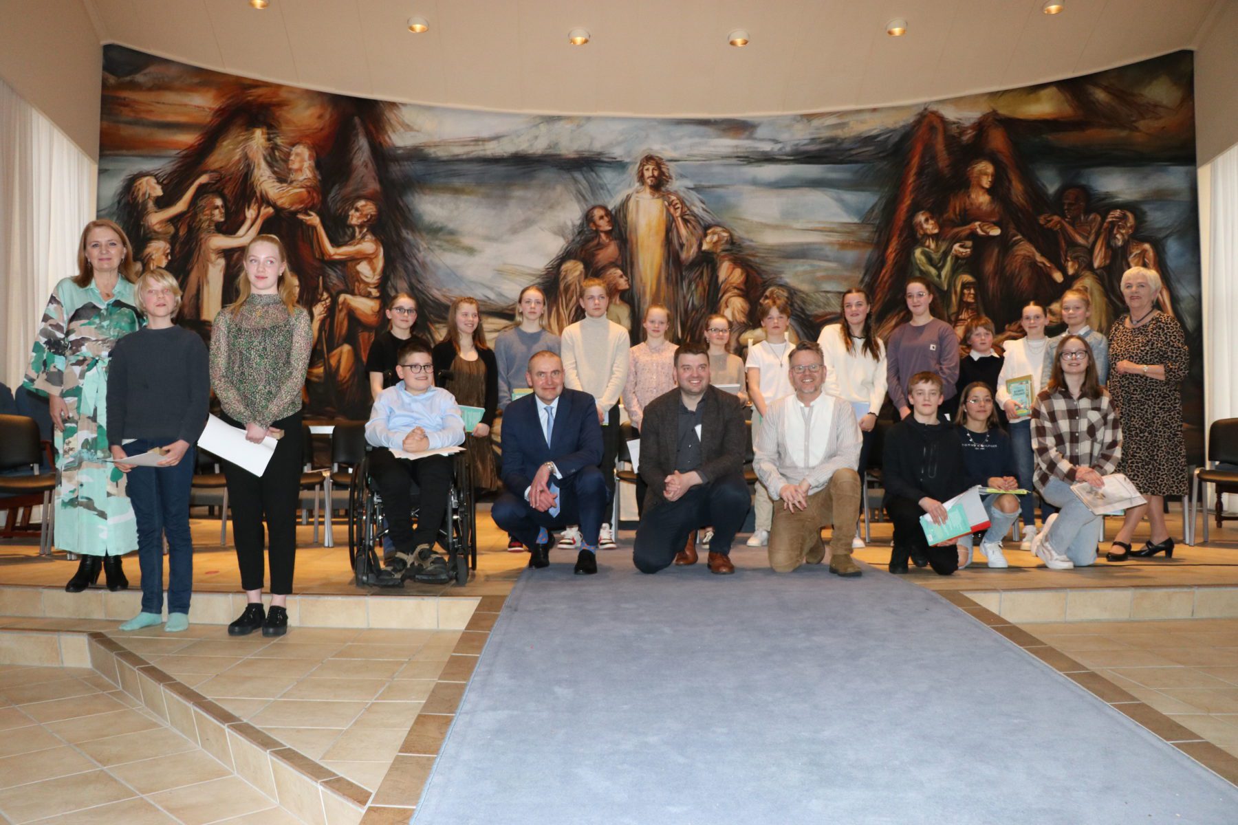 Þessi skipuðu þrjú efstu sætin. Emil Arthúr Júlíusson í Víðistaðaskóla sem endaði í 1. sæti, Vilhjálmur Hauksson í Setbergsskóla í 2. sæti og Kristín Vala Björgvinsdóttir í Engidalsskóla í 3. sæti. Hé með Rósu Guðbjartsdóttur bæjarstjóra.