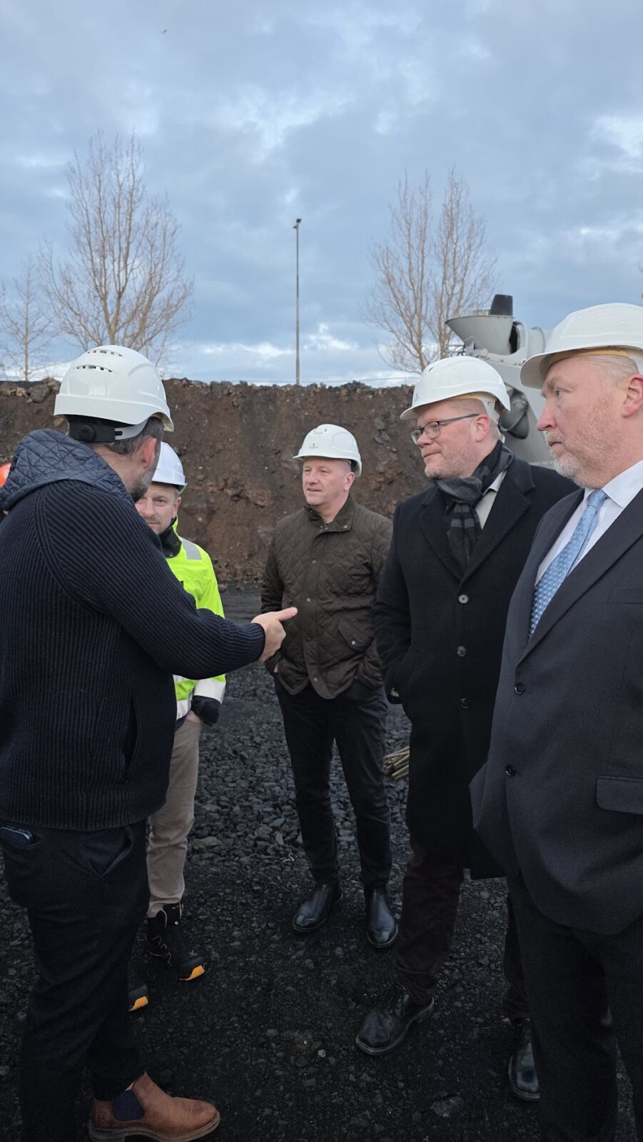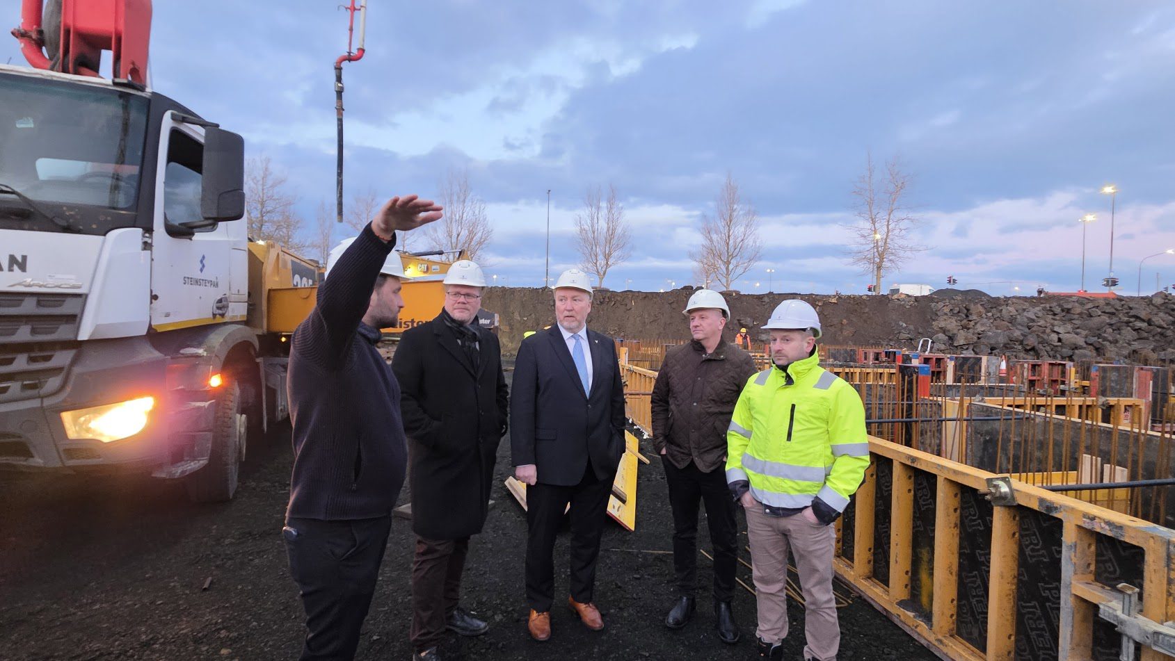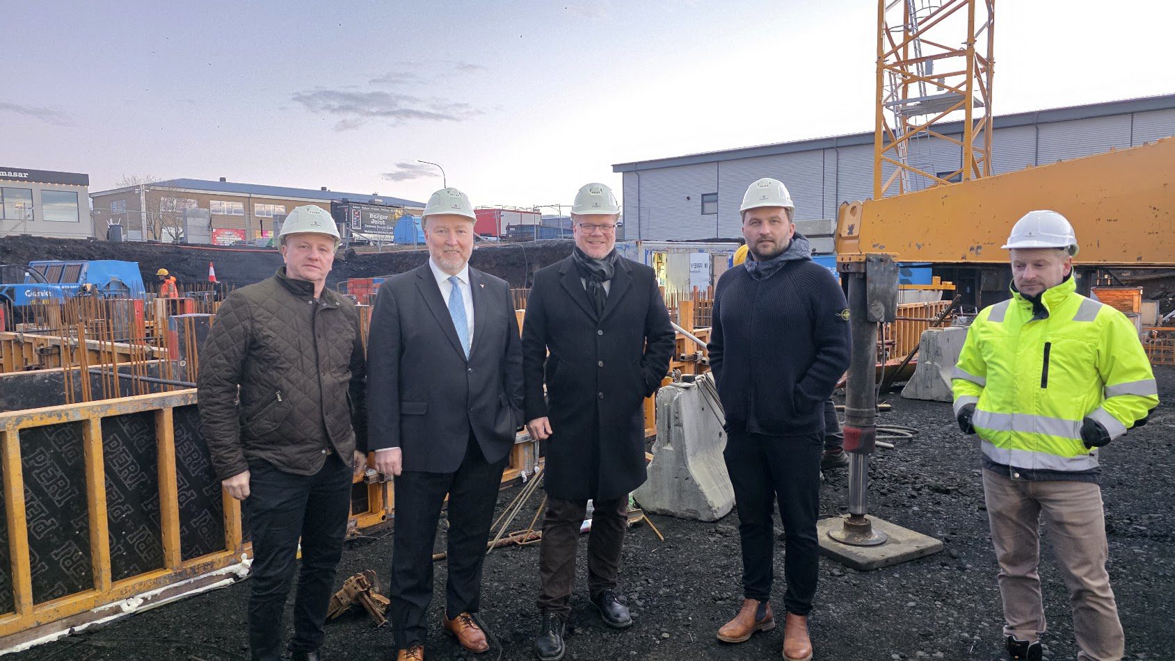 Alls verða 106 íbúðir í þessu 6.-8. hæða fjölbýlishúsi að Reykjavíkurvegi 60-62. Verslanir á þeirri fyrstu en íbúðir á þeim efri auk bílakjallara. Ólafur Páll Snorrason, framkvæmdastjóri OS bygginga ehf. tók á móti bæjarstjóranum ásamt fleirum og leiddi um grunninn sem er afar stór og mikill. Framkvæmdum miðar vel.