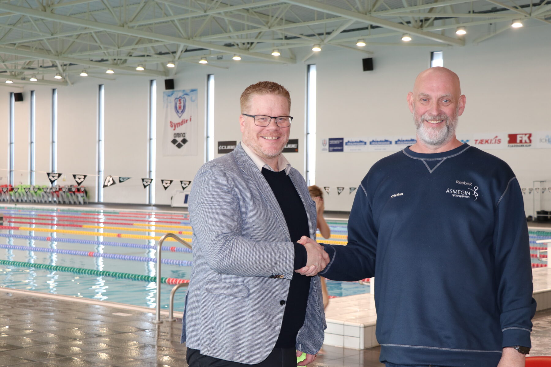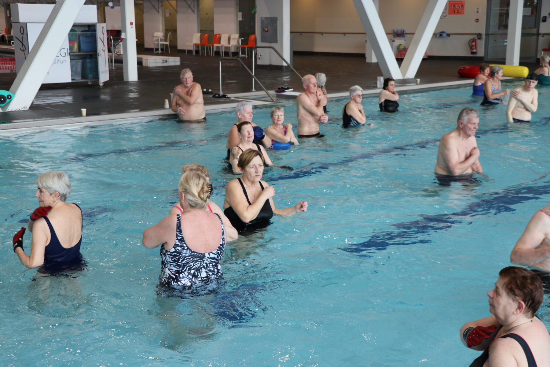 „Nægt pláss í lauginni,“ segir Kristinn Magnússon hjá Ásmegin sjúkraþjálfun sem sér um sundleikfimi fyrir 67 ára og eldri Hafnfirðinga í Ásvallarlaug tvisvar í viku. Tímarnir eru mánudaga og fimmtudaga frá 14.40-15.20. Kátt var tíma hjá Kristni fyrir helgi og í dag var samstarfið við Hafnarfjarðarbæ framlengt. Bæjarstjóri og Kristinn rituðu undir áframhaldandi samstarfssamning.