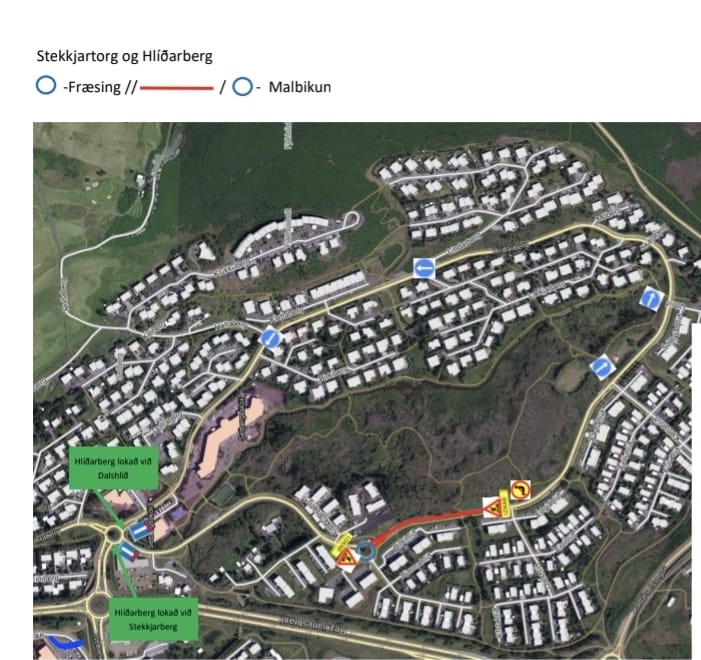 Vegna vegaframkvæmda verður Stekkjartorg (Hlíðarbergi við Brekkuhlíð) lokað fimmtudaginn 4.septemeber frá kl.9:00-14:00. Verið er að fræsa fyrir malbikun.
