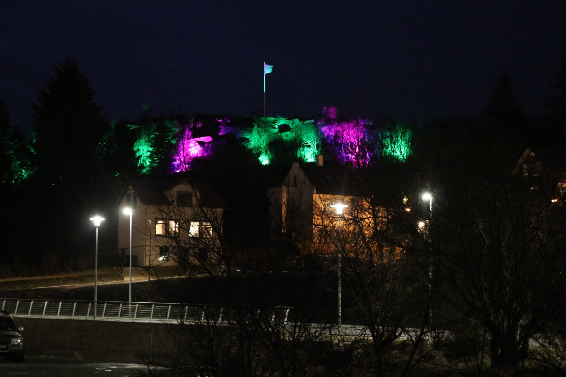 Flensborgarskólinn og Hamarinn hafa nú verið lýstir upp í einkennislitum Vetrarhátíðar, grænum og fjólubláum.