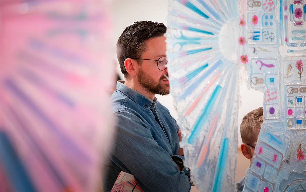 Í bogastofunni á efri hæð safnsins verða einnig til sýnis verk eftir þátttakendur sumarnámskeiðs Hafnarborgar í myndlist.