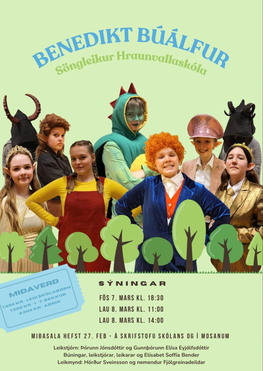Nemendur í unglingadeild Hraunvallaskóla hafa unnið hörðum höndum í allan vetur að uppsetningu á söngleiknum Benedikt Búálfur. Nú er komið að uppskerunni. Þrjár sýningar verða dagana 7. og 8. mars. Miðasala á skrifstofu skólans og í Mosanum. Þetta er frábært leikrit sem krakkarnir elska.