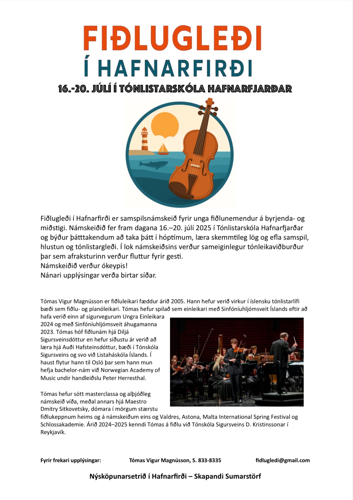 Tómas Vigur í samstarfi við Skapandi Sumarstörf verður með námskeiðið Fiðlugleði í Hafnarfirði fyrir fiðlunemendur á aldrinum 7-16 ára! 16.-20. júlí í Tónlistarskóla Hafnarfjarðar. Námskeiðið er ókeypis!